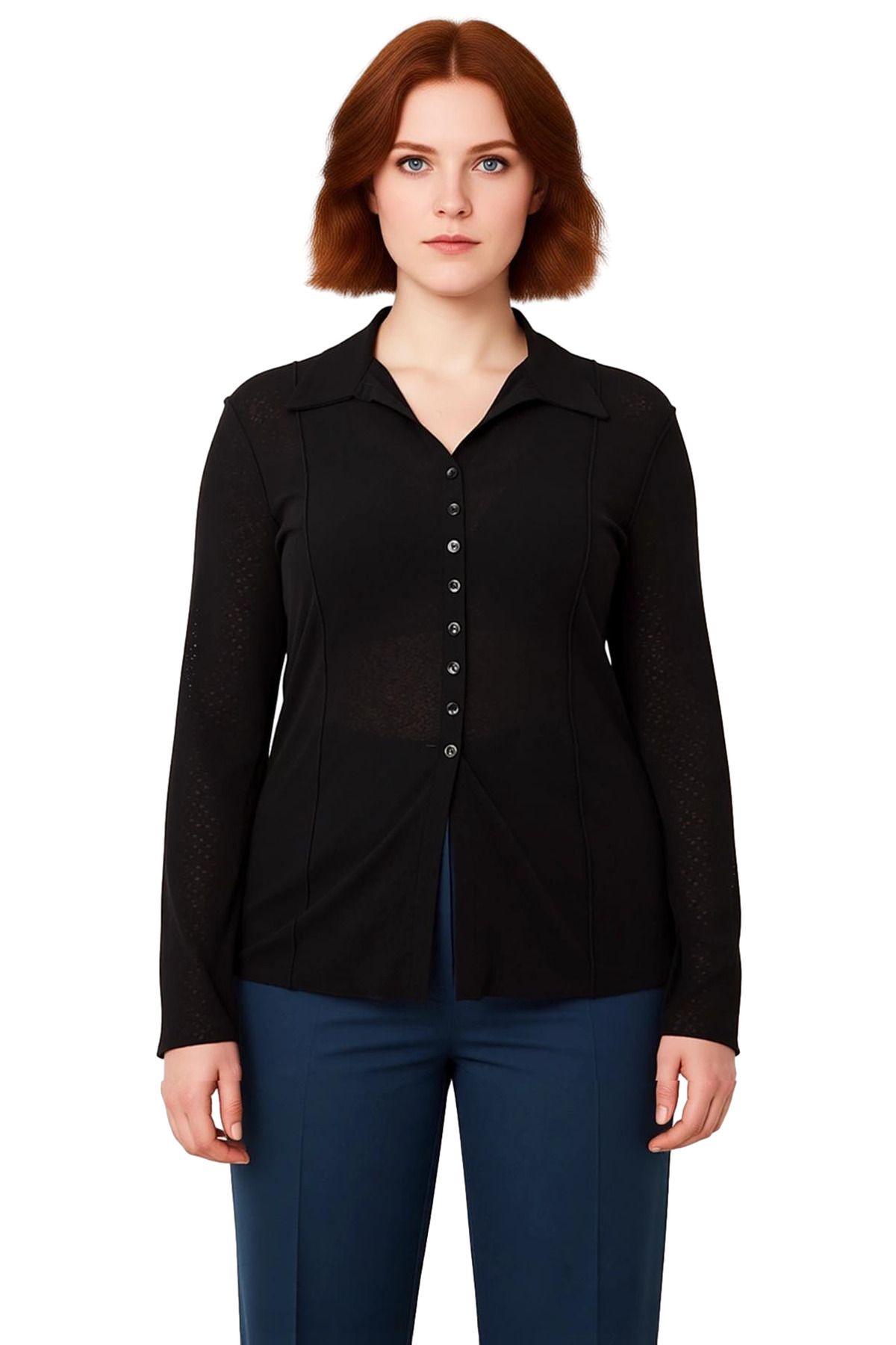 Bu özel tasarım bluz, büyük beden giyimde stil ve konforu bir araya getiriyor. Regular kalıbı, düz deseni ve klasik gömlek yaka detayı ile zamansız bir şıklık sunuyor. Örme kumaşın yumuşaklığı ve hafifliği, gün boyu rahat bir kullanım sağlıyor. Standart kesim uzun kollu tasarımı, ilkbahar ve sonbahar gibi geçiş mevsimleri için ideal bir seçenek oluşturuyor. Casual ve günlük kullanım için mükemmel bir tercih olan bu bluz, her kadının gardırobunda bulunması gereken temel parçalardan biri. Köpük dokuma tipi, kumaşa eşsiz bir doku ve dökümlülük kazandırırken, %100 polyester materyal bileşeni, ürünün dayanıklılığını ve kolay bakımını garanti ediyor. Türkiye’de üretilen bu bluz, T01 yıkama talimatlarına uyulduğunda uzun yıllar ilk günkü gibi kalacaktır. Bu bluz, modern kadının dinamik yaşam tarzına uyum sağlayacak şekilde tasarlandı. Hem şık görünmek isteyen hem de rahatlıktan ödün vermek istemeyenler için ideal bir seçenek. Jean pantolonlarla rahat bir kombin oluşturabilir, kumaş pantolonlarla daha resmi bir görünüm elde edebilirsiniz. Bu bluz, farklı stil tercihlerine kolayca uyum sağlayabilme özelliğiyle öne çıkıyor. Kendinizi iyi hissetmenizi ve harika görünmenizi sağlayacak bu parça, gardırobunuzun vazgeçilmez bir parçası olacak. Bu ürün, her kadının kendine özgü tarzını yansıtmasına olanak tanıyor. Kaliteli malzemesi ve özenli işçiliği ile fark yaratan bu bluz, stilinize sofistike bir dokunuş katacak. Bu ürün, günün her saati şıklığınızı ve konforunuzu ön planda tutacak şekilde tasarlandı. Kadınların zarafetini ve gücünü vurgulayan bu bluz, stilinize yeni bir soluk getirecek.