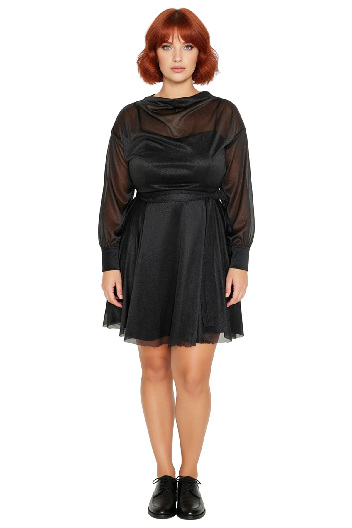 Ürün Özellikleri: Skater kalıp, %100 polyester materyal, düz desen, degaje yaka, düşük kol, örme ve tül kumaş, siyah renk, mini boy.