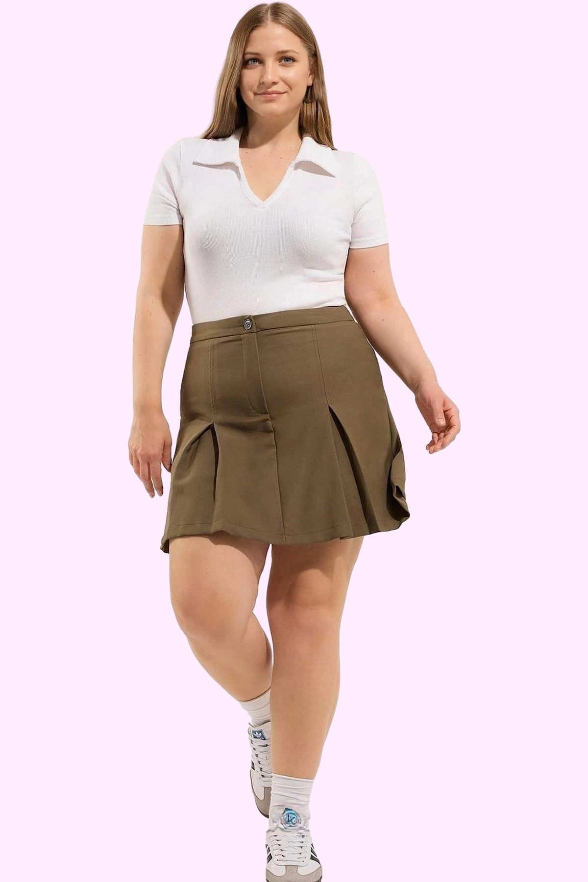 Büyük beden kadınlar için özel olarak tasarlanan haki renkli şort etek, yaz aylarının şık ve rahatlığını sunuyor. A-line silüetiyle her vücut tipine mükemmel uyum sağlayan bu etek, gün boyu konfor ve stil vaat ediyor. Finike dokuma tekniği ile üretilen yüksek kaliteli kumaşı, nefes alabilir ve dayanıklı yapısıyla öne çıkıyor. Düz desen ve haki rengi ile her kombini tamamlayacak kadar çok yönlü. Yaz sezonuna özel olarak tasarlanan bu etek, günlük aktivitelerinizde ve hafta sonu planlarınızda rahatlıkla tercih edebileceğiniz bir model. Kısa boyu ve pileli detayı ile hem şık hem de modern bir görünüm kazandırıyor.