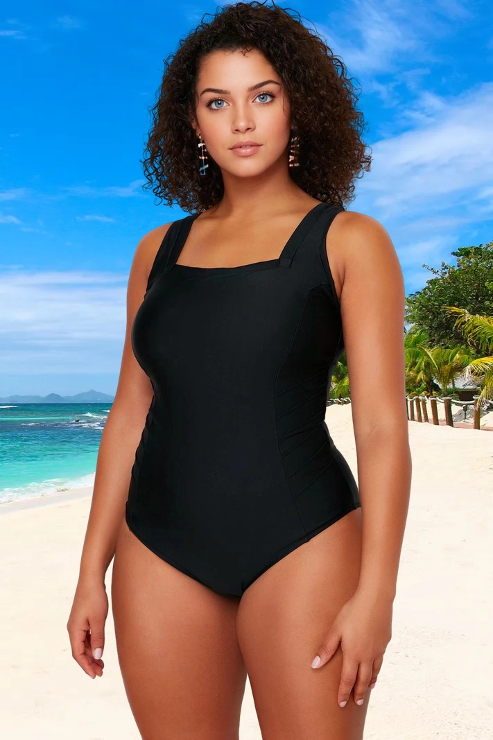 Büyük Beden Kapsız Askılı Kare Yaka Siyah Örme Mayo