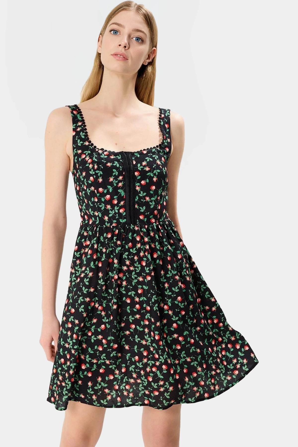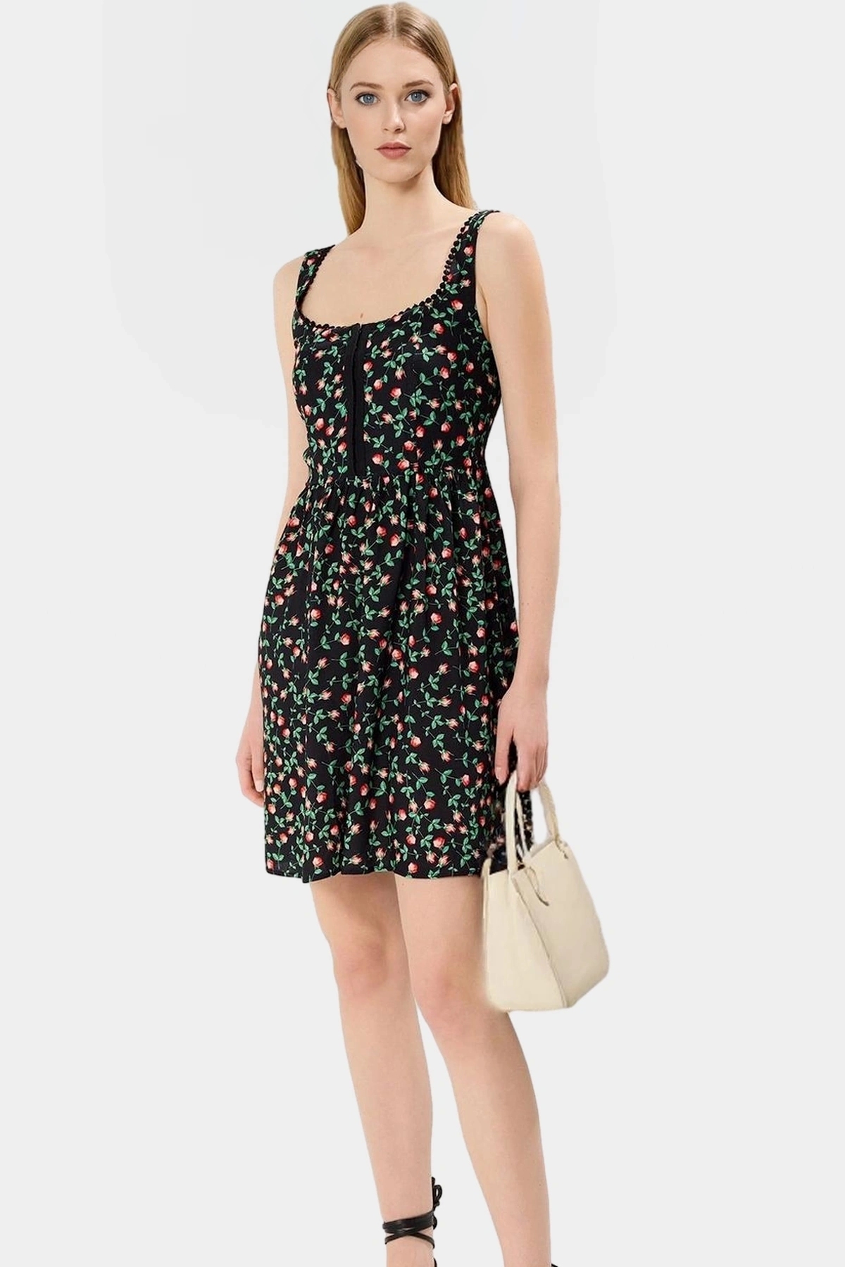 Zarif ve rahatlığı bir arada sunan bu mini elbise, yaz aylarının vazgeçilmez parçanız olacak. 100% viskoz kumaştan üretilen elbise, yumuşak dokusuyla teninize nazikçe dokunurken, nefes alabilir yapısıyla gün boyu konfor sağlar. Skater kalıbı sayesinde vücut hatlarınızı mükemmel bir şekilde ortaya koyarken, belden açılan eteği hareket özgürlüğü sunar. Siyah zemin üzerine serpiştirilmiş çiçek deseni, elbiseye romantik bir hava katarken, agraflı detayı ise şıklığı tamamlar.