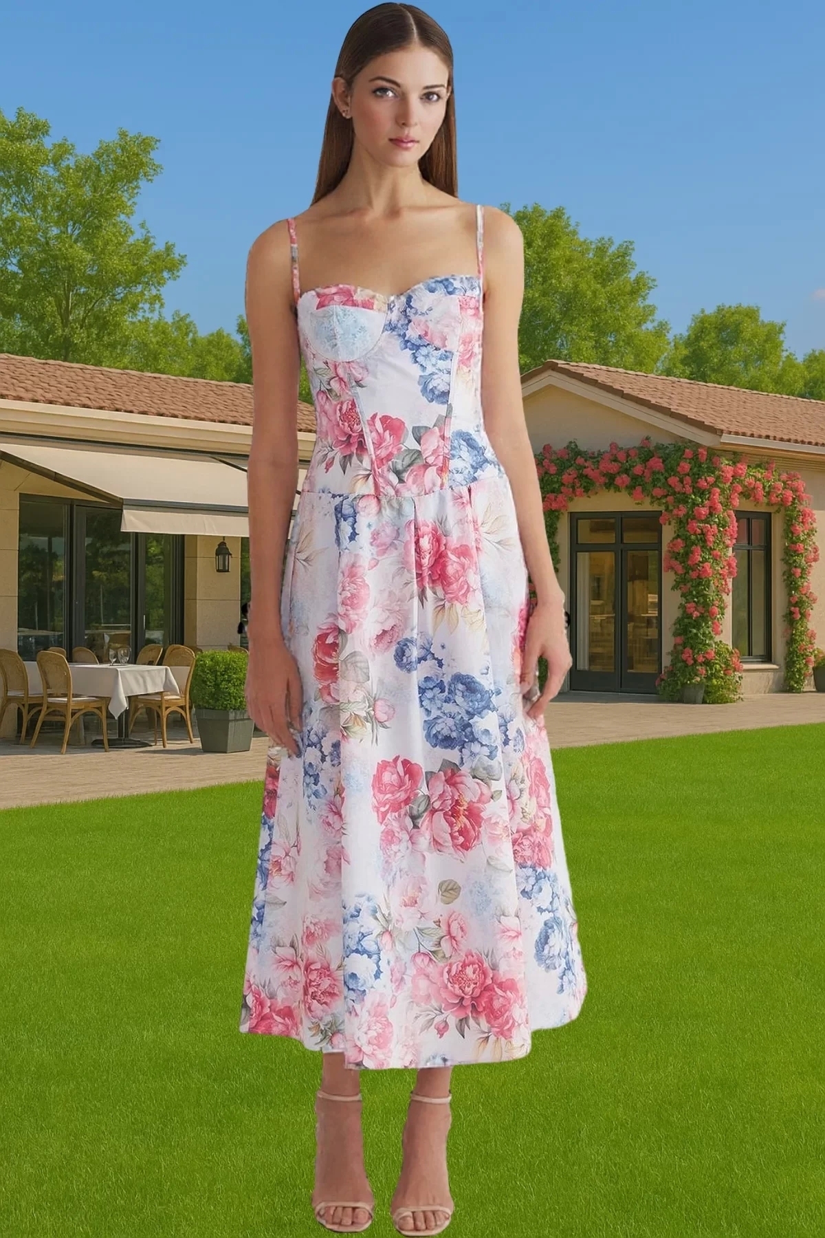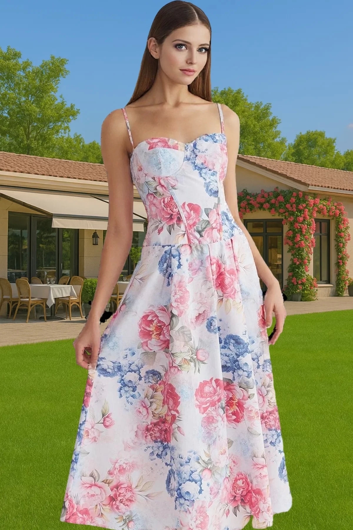 Çiçekli Desenli A Kesim Midi Boy Poplin Abiye Elbise Özenle Seçilmiş Mükemmel Uyum