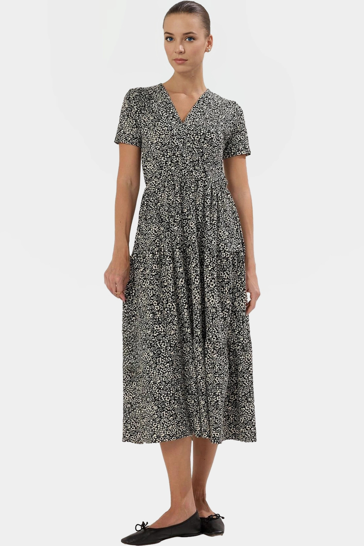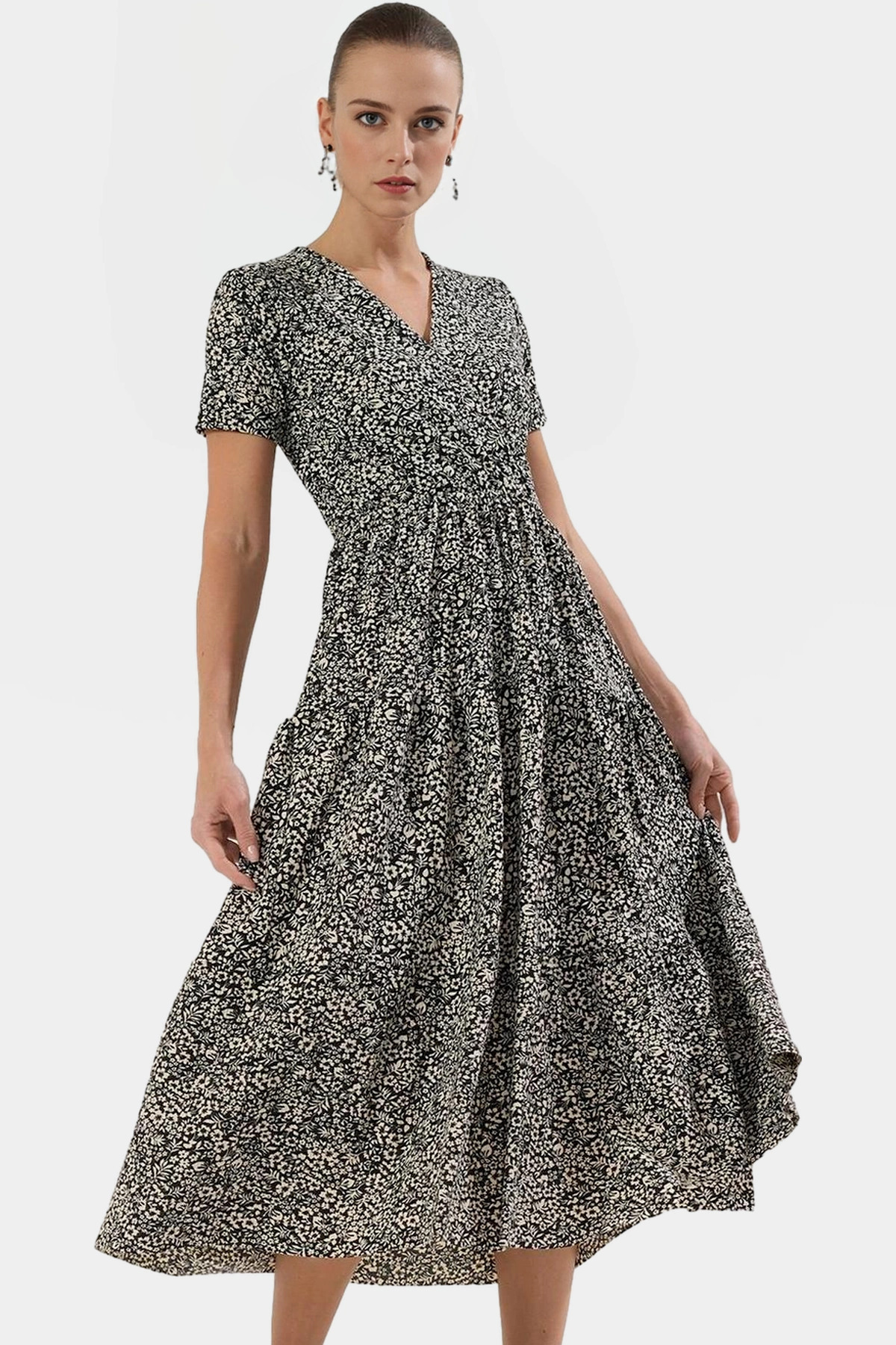 Elbisenin belden açılan tasarımı, vücut hatlarınızı zarif bir şekilde ortaya koyarken, midi boyu her vücut tipine uyum sağlar. Kısa kollu ve V yakalı tasarımı, elbisenin şıklığını tamamlarken, aynı zamanda pratik bir kullanım sunar. Siyah rengi, her türlü aksesuara ve ayakkabıya uyum sağlayarak, kombinlerinizde size geniş bir yelpaze sunuyor. Elbisenin bakımı da oldukça kolaydır, makinede yıkanabilir özelliği sayesinde zaman kazanırsınız.