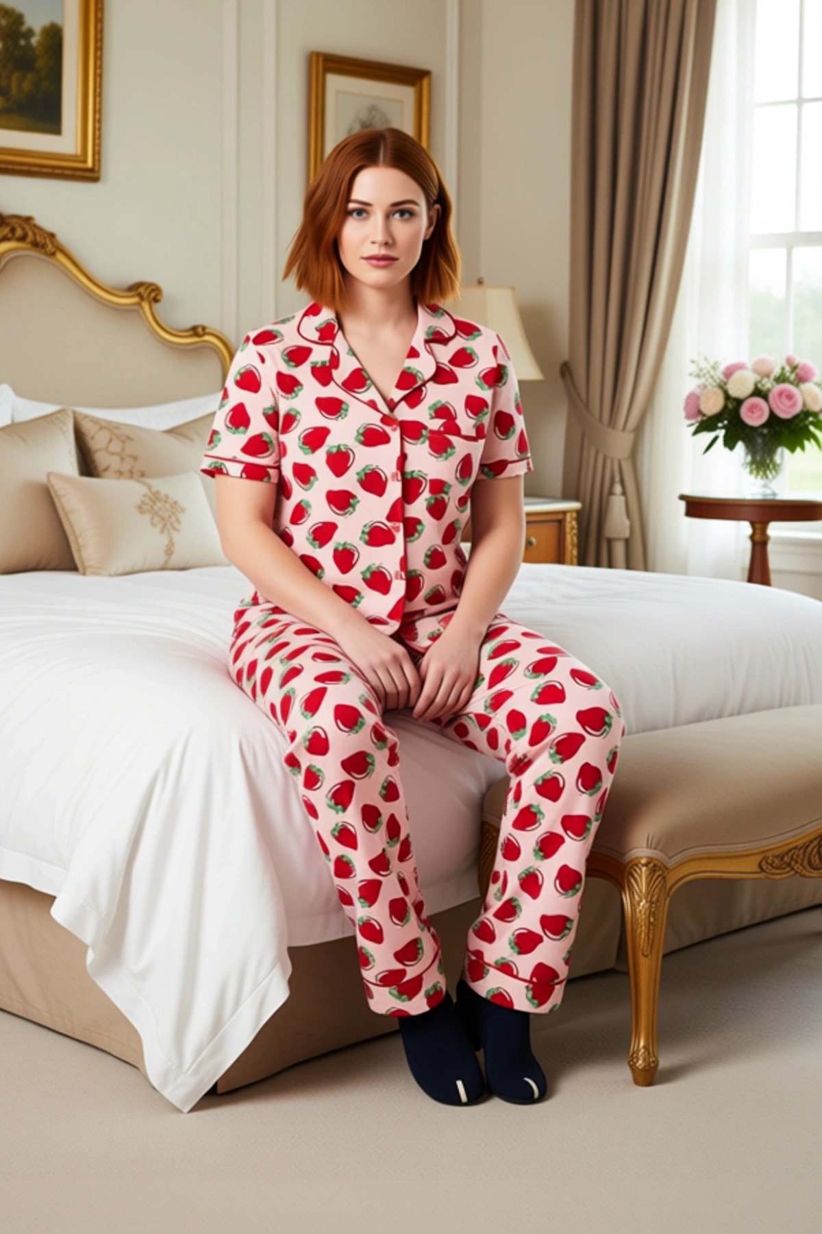 Çilek Baskılı Gömlek Yaka Pijama Takımı Kadın Fonksiyonel Dayanıklı Kaliteli Konforlu Spor