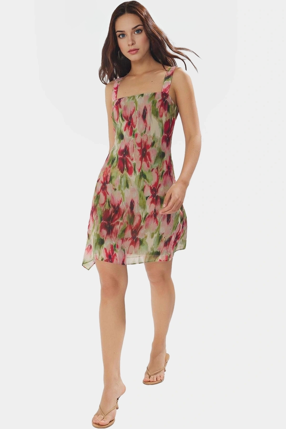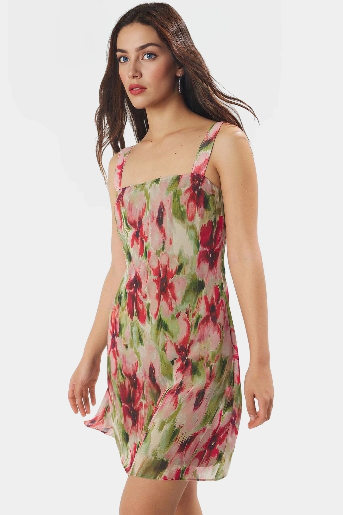 Yaz aylarının enerjisini yansıtan bu çok renkli soyut desenli mini elbiseyle tanışın! Hafif ve nefes alan şifon dokuma kumaştan üretilen elbise, gün boyu konfor sunar. A kesim modeli ile her vücut tipine uyum sağlar, özgür ve rahat bir stil yaratır. Kolsuz tasarımı ile sıcak yaz günlerinde serin kalmanızı sağlar. Fırfırlı detaylarıyla şıklığınıza şıklık katar.