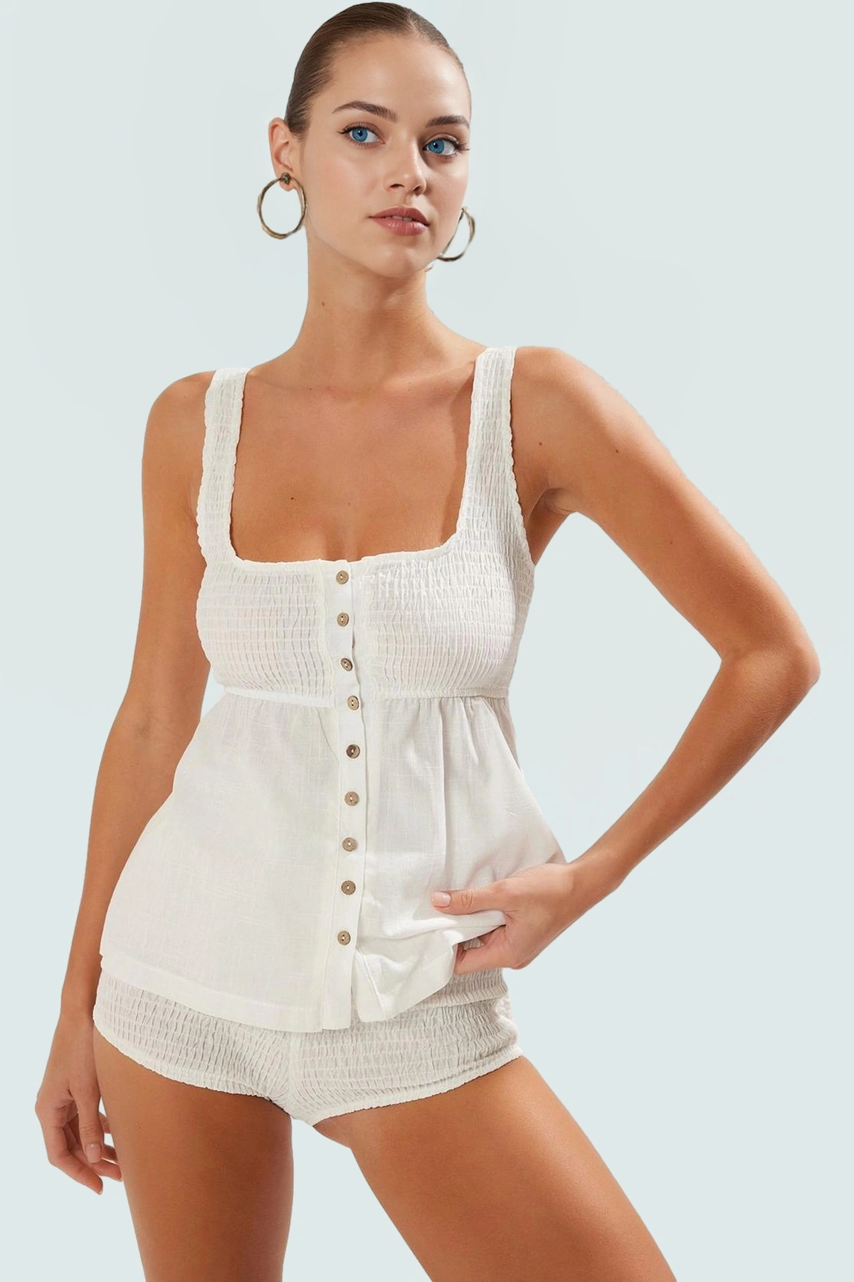 Yaz aylarında rahatlık ve şıklığı bir arada arayanlar için ideal bir seçim olan bu beyaz bluz şort takım, %100 pamuk dokuma kumaştan üretilmiştir. Nefes alan yapısıyla gün boyu konfor sunarken, dokulu tasarımıyla da şıklığınıza şıklık katar. Reglan kol detayı ve dik yakasıyla hem modern hem de zamansız bir tarz yakalayabilirsiniz. Modelin ölçüleri: Boy: 177cm Göğüs: 83cm Bel: 63cm Kalça: 92cm. Manken S-36 beden giymektedir. Oversize kalıbı sayesinde, vücut tipinize uyum sağlayacak rahat bir oturuş sunar. Plaj, havuz, ya da şehir yürüyüşleri için idealdir. Makinede 35 derecede yıkanabilir. Türkiye’de üretilmiştir.