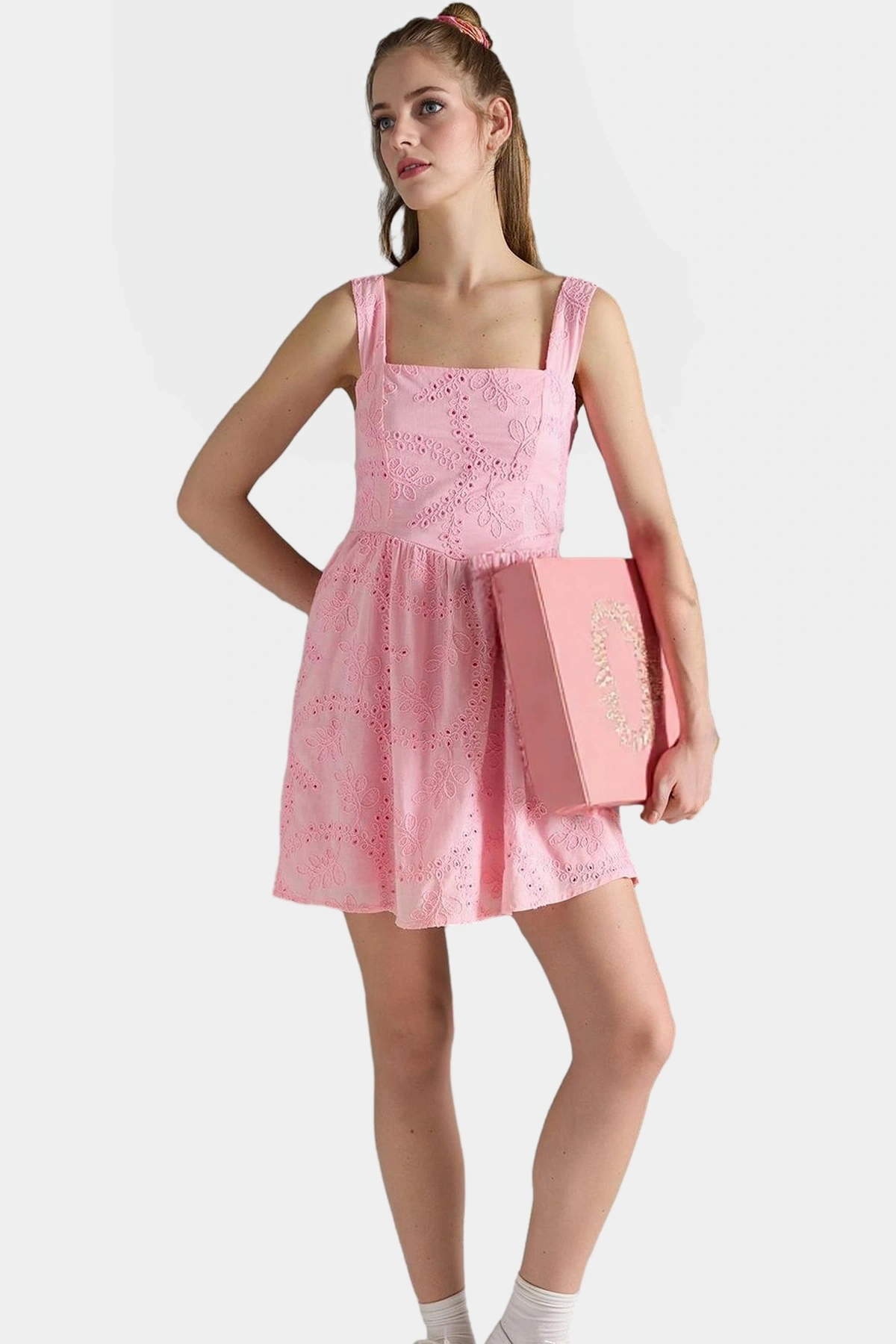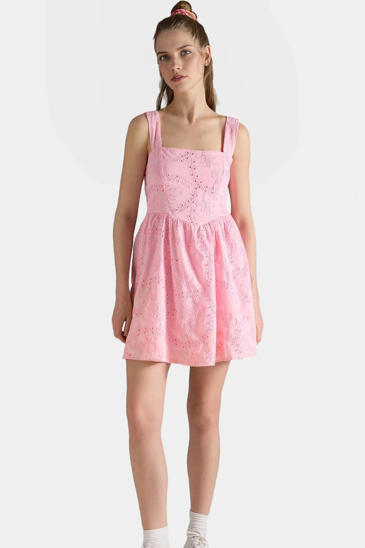 Dokuma Pamuklu Mini Elbise Belden Açılan Etekli Yazlık Mükemmel Uyum Seçkin Malzeme - Görsel 2