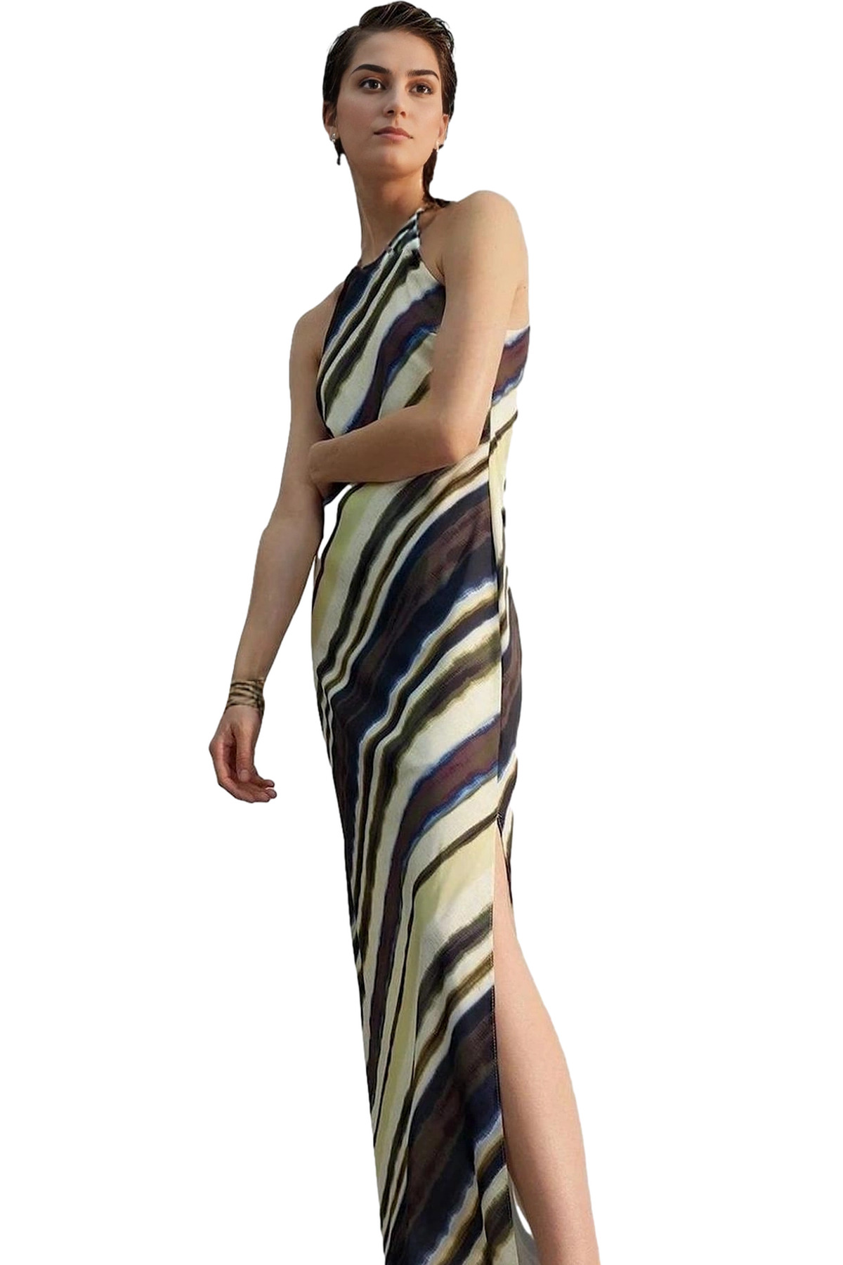 Yaz aylarında şık ve rahatlığı bir arada arayanlar için mükemmel bir seçim olan bu A-line maxi elbise, dokuma polyester kumaştan üretilmiştir. Nefes alabilir yapısıyla sıcak günlerde bile serin kalmanızı sağlar. Halter yakası, ince askıları ve A-line kesimiyle feminen ve zarif bir görünüm sunarken, yanlardaki yırtmaçlar ise özgürce hareket etmenizi sağlar. Düz desen ve mat saten dokusuyla hem günlük hayatta hem de özel davetlerde rahatlıkla kullanabilirsiniz.