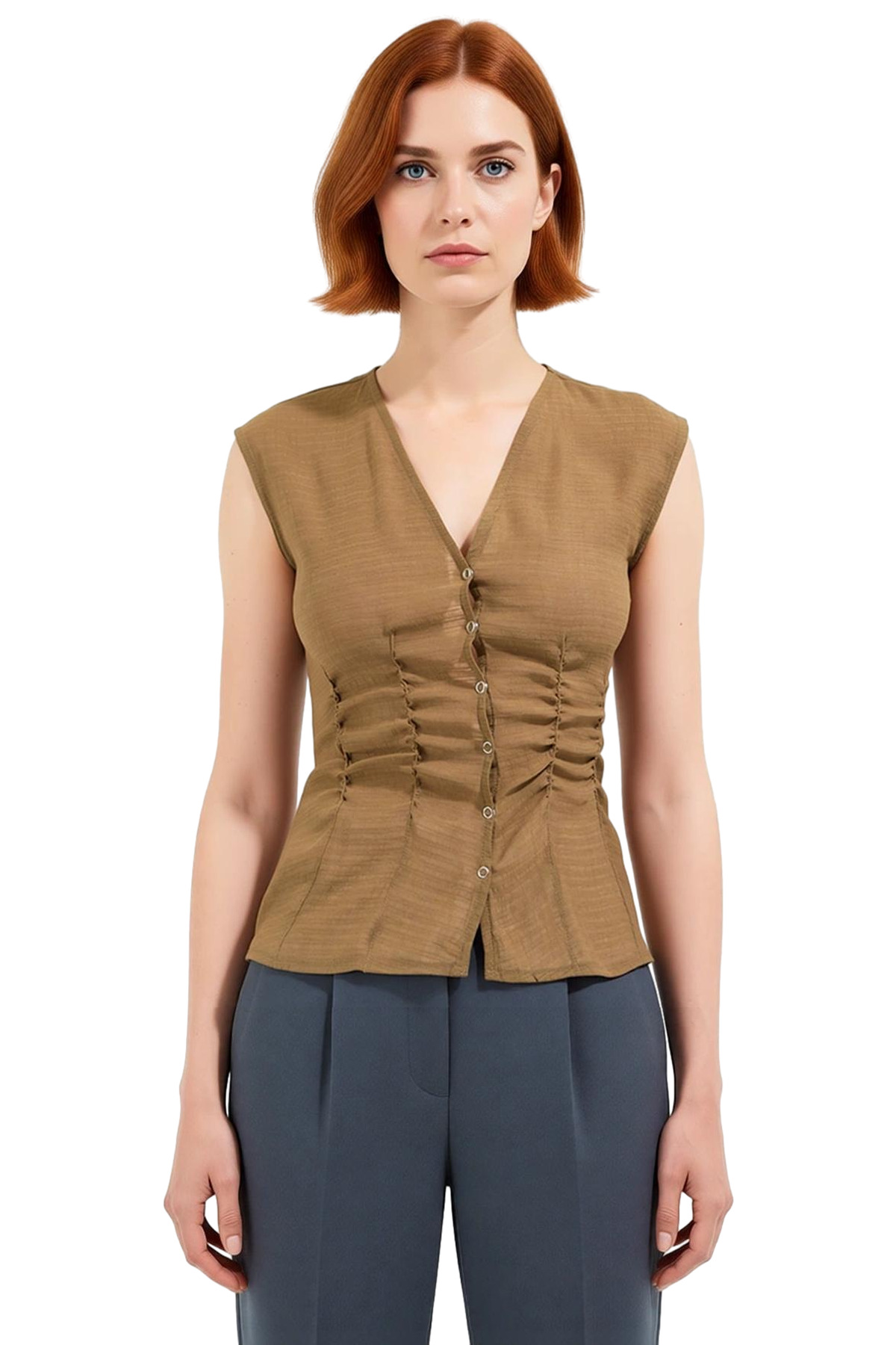Yaz aylarının vazgeçilmez parçası olacak bu haki bluz, şıklığı ve rahatlığı bir araya getiriyor. V yakası ve fitted kalıbıyla vücut hatlarınızı zarifçe ortaya koyarken, kolsuz tasarımıyla sıcak havalarda serin kalmanızı sağlar. Yüksek kaliteli dokuma kumaşın yumuşak dokusu, gün boyu konforlu bir kullanım sunar. Casual tarzınıza mükemmel bir uyum sağlayacak bu bluz, hem günlük hayatta hem de özel günlerde tercih edebileceğiniz şık bir seçenektir.