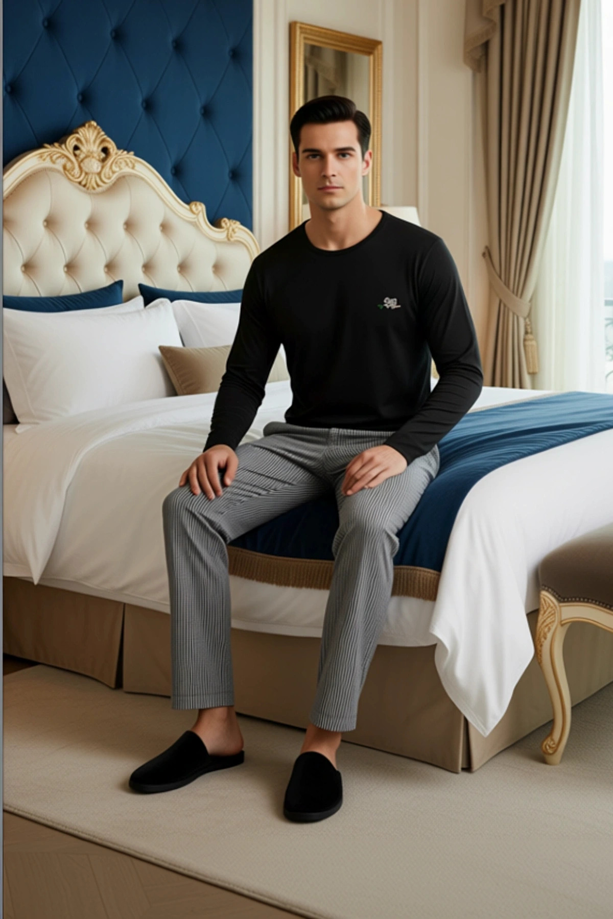 Erkekler için tasarlanmış bu pijama takımı, cool ve konforlu bir yaşam tarzını benimseyenler için idealdir. Üst kısım, uzun kollu ve bisiklet yakalı, üzerinde zarif bir koala nakışı bulunan siyah bir sweatshirt olarak öne çıkar. Alt kısım ise, klasik çizgili deseniyle dikkat çeken, boru paça bir pantolondur. Takımın ana materyali %95 polyester ve %5 elastan karışımından oluşur. Bu örme kumaş, gofre dokusu sayesinde hem yumuşak bir his verir hem de esnek yapısıyla gün boyu rahatlık sunar. Evde geçirilen zamanlarda maksimum konfor ve stil arayan erkekler için tasarlanmıştır. Siyahın zamansız şıklığı ve çizgili desenin enerjisi, bu takımı özel kılar. Üst kısmın bisiklet yaka tasarımı, boyun bölgesini rahatsız etmeden sıcak tutar. Standart kesim uzun kollu sweatshirt, hareket özgürlüğünü kısıtlamaz ve her vücut tipine uyum sağlar. Pantolonun boru paça kesimi, ayak bileklerinde sıkma yapmadan rahat bir kullanım sunar. %95 polyester ve %5 elastan içeren kumaş, nefes alabilirlik özelliği sayesinde terlemeyi azaltır ve vücuda nazikçe oturur. Gofre dokunun getirdiği hafif kabartmalı yüzey, kumaşa hoş bir dokusal derinlik katar. Bu pijama takımı, özellikle soğuk kış aylarında sizi sıcak tutacak şekilde özenle üretilmiştir. Bu pijama takımı, kış mevsiminde rahat ve şık bir ev giyimi seçeneği sunar. Altına uyumlu bir eşofman altı veya rahat bir tayt ile kombinleyerek ev içinde şık bir görünüm elde edebilirsiniz. Ayakkabı olarak ev terlikleri veya rahat spor ayakkabılar tercih edilebilir. Bu takım, hafta sonu dinlenirken veya sabahları güne başlarken size konfor ve stil sunar. Kolay bakımı sayesinde uzun ömürlü bir kullanım sağlar. Bu ürün Türkiye’de üretilmiştir.