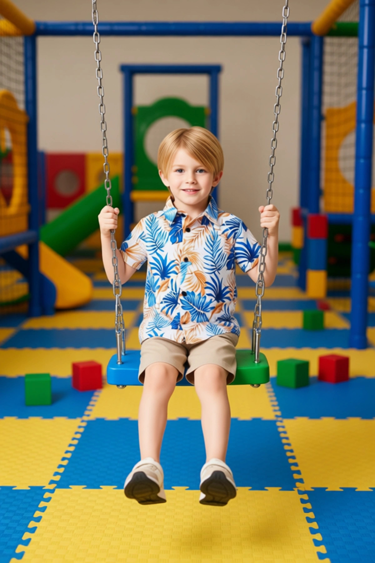 Bu erkek çocuk alt-üst takım, yaz mevsiminin enerjisini ve neşesini yansıtan tasarımıyla dikkat çekiyor. Kısa kollu gömlek, canlı ve dinamik bir yaprak deseniyle süslenmiş olup, çocuğunuzun enerjik ruhunu tamamlar. Gömleğin poplin dokuma kumaşı, hafifliği ve nefes alabilirliği sayesinde sıcak havalarda maksimum konfor sunar. Klasik gömlek yaka ve standart kol kesimi, zamansız bir stil sunarken, casual koleksiyonuna uygunluğu ile günlük kullanım için idealdir. Pamuk ve polyesterin dengeli birleşimi, kumaşın hem yumuşaklığını hem de dayanıklılığını artırır, bu da takımın uzun ömürlü olmasını sağlar. Gömleğin üzerindeki tropikal motifler, her an bir tatil havası estirir ve çocuğunuzun neşeli kişiliğini vurgular.