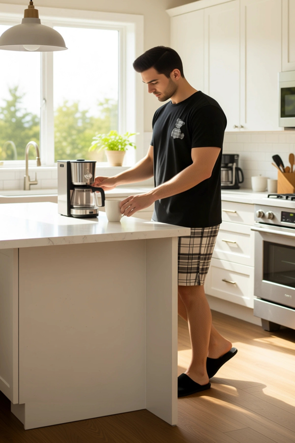 Bu erkek pijama takımı, rahatlığı ve şıklığı bir araya getiren iki parçalı bir settir. Üst kısım, klasik bisiklet yaka ve kısa kollu bir tasarıma sahiptir. Ön göğüs cebinde yer alan ekose desenli ayı figürü, takıma sevimli ve özgün bir dokunuş katmaktadır. Şortlar ise, aynı ekose deseniyle uyumlu bir şekilde tasarlanmıştır. %50 pamuk ve %50 polyester karışımı örme kumaş, cildinize yumuşak bir dokunuş sağlarken aynı zamanda nefes alabilirliği ile gün boyu ferah bir kullanım sunar. Bu rejenere süprem kumaş, dayanıklılığı ve kolay bakımı ile öne çıkarak uzun ömürlü bir kullanım vadeder. Ekose desenin zamansız çekiciliği, bu takımı hem ev içinde dinlenirken hem de rahat bir günlük stil için ideal bir seçenek haline getirir. Bu ürün, modern erkeğin konfor ve stil arayışına cevap veren şık bir alternatiftir. Takımın regular fit kalıbı, vücuda nazikçe oturarak hareket özgürlüğünü kısıtlamaz. Bisiklet yaka, rahat bir giyim deneyimi sunarken, kısa kollu tasarım özellikle sıcak mevsimlerde serin kalmanıza yardımcı olur. Şortların boru paça kesimi, rahat bir oturuş sağlayarak hareketlerinizi engellemez. Örme süprem kumaşın sunduğu yumuşaklık, cildinize nazikçe dokunur ve günün her anında maksimum konforu garanti eder. Bu pijama takımı, evde dinlenirken veya günlük rutinlerinizi yerine getirirken kendinizi rahat ve iyi hissetmenizi sağlamak üzere özenle tasarlanmıştır. Hem fonksiyonel hem de estetik açıdan tatmin edici olması, onu gardırobunuzun vazgeçilmez bir parçası yapacaktır. Bu ürün, rahatlığı önceliklendiren erkekler için harika bir seçimdir. Yaz mevsiminin sıcak günleri için biçilmiş kaftan olan bu pijama takımı, hafif ve nefes alabilen yapısıyla serinlik sunar. Siyah üst ve ekose desenli şortlar, şık ve uyumlu bir görünüm sergiler. Bu takımı, ev içinde rahat terliklerle veya dışarıda spor ayakkabı ve rahat bir tişört ile kombinleyerek kullanabilirsiniz. Kot şortlar veya rahat kesim keten pantolonlarla da uyum sağlayarak farklı stil alternatifleri yaratabilirsiniz. Bakımı oldukça pratiktir; çamaşır makinesinde yıkanabilir ve düşük ısıda ütülenebilir, böylece uzun yıllar ilk günkü görünümünü korur.