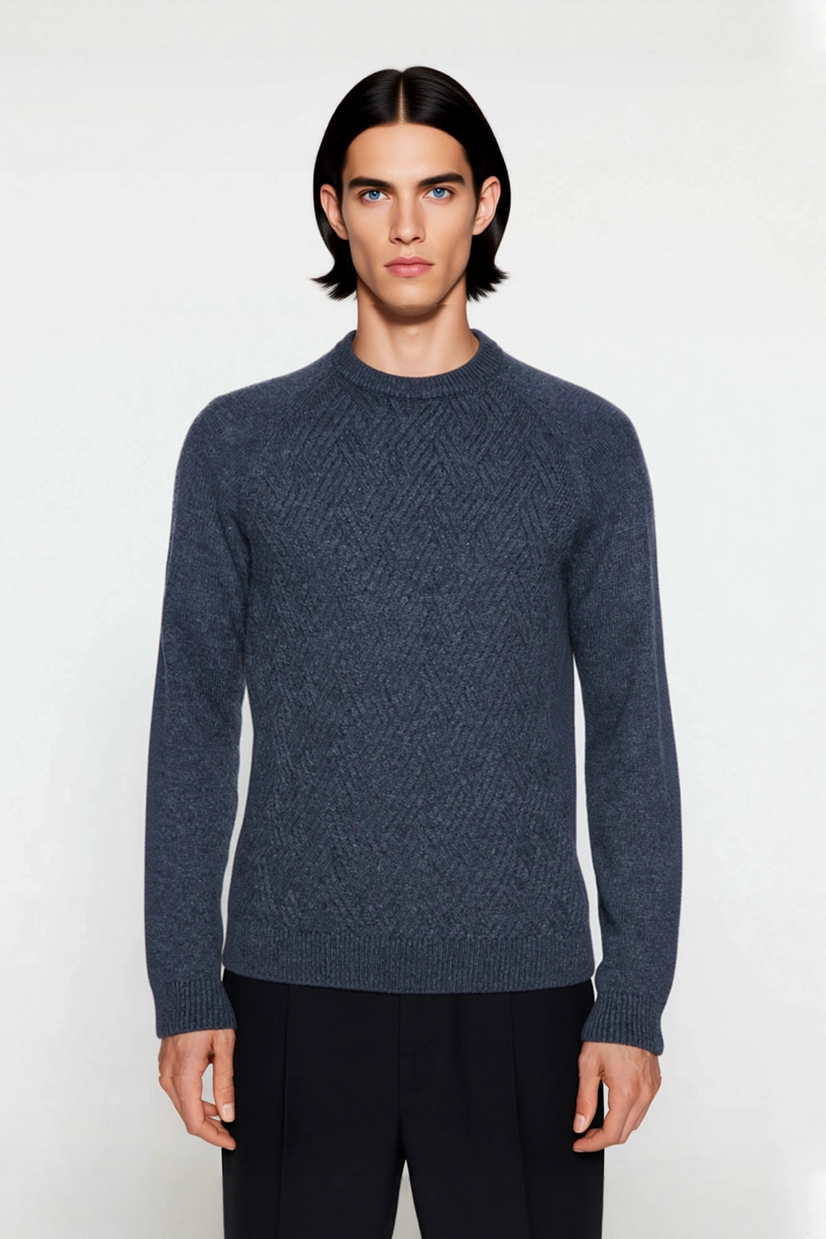 Ürün Özellikleri: Fitted kalıp, akrilik polyester yün karışımı materyal, dokulu desen, bisiklet yaka, reglan kol, triko kumaş, lacivert renk, baskısız tasarım.