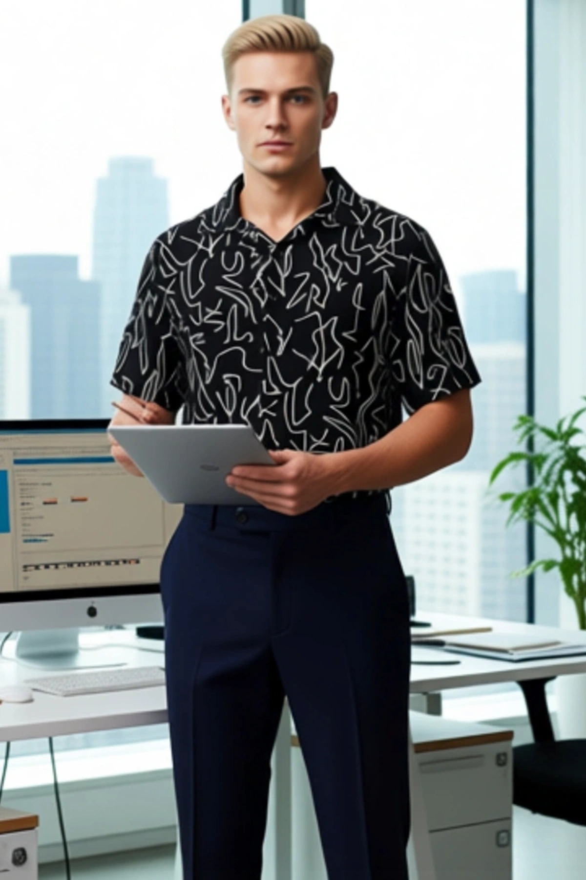 Yaz aylarının vazgeçilmezi olan bu siyah geometrik desenli gömlek, %100 viskondan üretilmiş olup, gün boyu rahatlık ve serinlik sunar. Apaş yakası ve standart kol tasarımı ile modern bir görünüm sergilerken, regular fit kalıbı her vücut tipine uyum sağlar. Dokuma kumaş yapısı, nefes alabilirliği artırırken, cepsiz tasarımı minimalist bir şıklık sağlar. Baskısız yapısı sayesinde her tarza kolayca uyum sağlar.