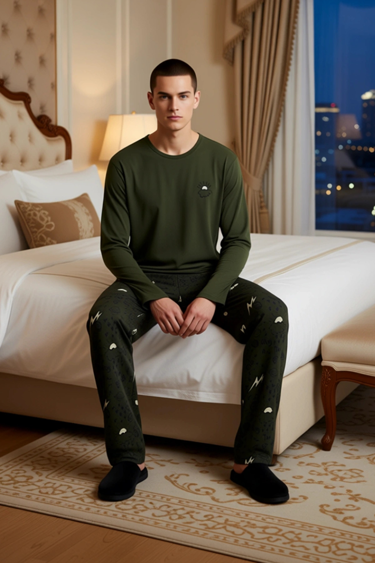 Bu erkek pijama takımı, %100 pamuk içeriğiyle maksimum konfor sunar. Üst kısım, bisiklet yaka ve uzun kollu bir tasarıma sahiptir. Üzerindeki zarif nakış detayı, takıma sofistike bir dokunuş katarken, haki rengi zamansız bir şıklık sunar. Alt kısım ise aynı haki renkte olup, üzerinde dikkat çekici ve modern bir galaksi temalı desen bulunmaktadır. Bu desen, takıma dinamik bir görünüm kazandırır. Regular fit kalıbı, hareket özgürlüğü sağlayarak gün boyu rahatlık sunar. Süprem kumaş dokusu, yumuşaklığı ve nefes alabilirliği ile bilinir, bu da takımı evde kullanım için ideal kılar. Bu pijama takımı, hem dinlenirken hem de evde geçirilen zamanlarda şık ve rahat olmak isteyen erkekler için tasarlanmıştır. Takımın üst kısmında yer alan bisiklet yaka ve uzun kollu kesim, klasik bir pijama görünümü sunarken, üzerine işlenen nakış detayı ürüne özgün bir karakter kazandırır. Alt kısımda bulunan boru paça pantolon, rahat bir uyum sağlayarak hareketlerinizi kısıtlamaz. Regular fit kalıp, her vücut tipine uyum sağlayarak konforu ön planda tutar. %100 pamuk materyali, cildinize dost bir his verir ve nefes alabilirlik özelliği sayesinde gece boyunca ferah kalmanızı sağlar. Örme kumaşın yumuşak dokusu, ürüne ekstra bir konfor katmanı ekler. Bu pijama takımı, evdeki rahat anlarınızda stilinizden ödün vermek istemeyenler için mükemmel bir seçenektir. Bu pijama takımı, özellikle kış aylarında tercih edilebilir. Haki rengi ve galaksi desenleri, mevsime uygun bir atmosfer yaratır. Bu takımı, rahat bir ev terliği ve yumuşak bir sabahlıkla kombinleyerek evde tam bir rahatlık deneyimi yaşayabilirsiniz. Alternatif olarak, rahat bir sweatshirt ve spor ayakkabılarla hafta sonu evdeki aktiviteleriniz için de kullanabilirsiniz. Takımın bakımı oldukça kolaydır; makinede yıkanabilir ve düşük ısıda ütülenebilir olması, günlük kullanımını pratikleştirir.