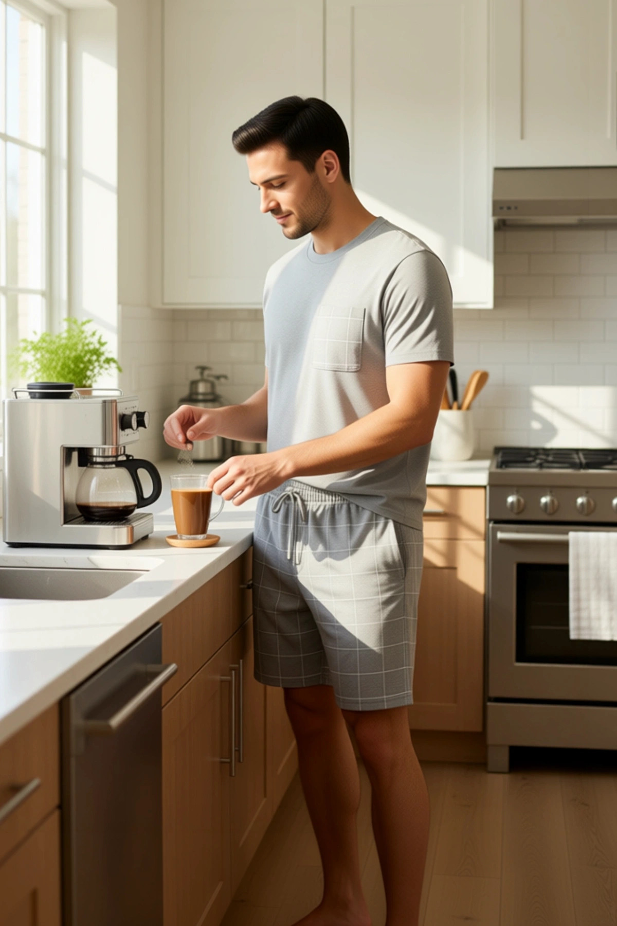Erkeklere özel bu pijama takımı, %100 pamuk materyali ile maksimum konfor sunar. Melanj gri rengi ve ince ekose deseni, takıma sofistike bir görünüm kazandırır. Regular fit kalıbı, her vücut tipine uyum sağlayarak rahat bir kullanım sunar. 24/1 penye süprem örme kumaş, yumuşaklığı ve nefes alabilirliği ile gün boyu ferahlık hissi verir. Bu alt-üst takım, evde geçirilen zamanı daha keyifli ve rahat kılmak için tasarlanmıştır. Casual ve günlük giyim tarzını benimseyenler için ideal bir seçenektir. Cool ve konforlu bir duruş sergilemek isteyen erkeklerin tercihi olacaktır. Takımın bisiklet yaka ve kısa kollu tişörtü, hareket kabiliyetini kısıtlamayan bir tasarıma sahiptir. Tişörtün üzerinde bulunan kullanışlı cep, küçük eşyalarınızı taşımak için pratik bir çözüm sunar. Şortun boru paça kesimi, rahat bir oturuş sağlarken, belindeki lastik ve büzgü ipi sayesinde kişiye özel bir uyum elde edilebilir. Örme kumaşın esnek yapısı, uyku sırasında veya evdeki aktivitelerinizde size hareket serbestliği tanır. Bu pijama takımı, hem görsel olarak çekici hem de dokusal olarak rahatlatıcı bir deneyim sunar. Yaz mevsiminin sıcak günlerinde serin kalmanızı sağlayacak bu pijama takımı, ev giyiminde rahatlığa öncelik verenler için uygundur. Beyaz bir basic tişört ve spor ayakkabı ile rahat bir ev kombini oluşturabilirsiniz. Daha dinamik bir görünüm için ise açık renkli bir jogger pantolon ve sneakerlarla da kombinleyebilirsiniz. Bu pijama takımının bakımını yaparken, renklerin canlılığını korumak için düşük sıcaklıkta yıkama ve ters çevirerek kurutma önerilir.
