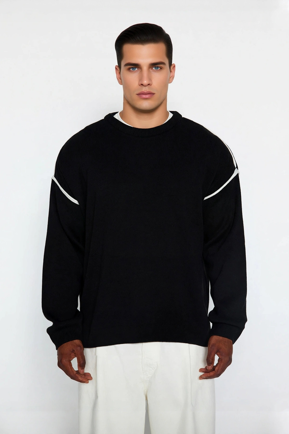 Ürün Özellikleri: Oversize kalıp, akrilik materyal, biye detaylı desen, bisiklet yaka, düşük kol, triko kumaş, siyah renk.