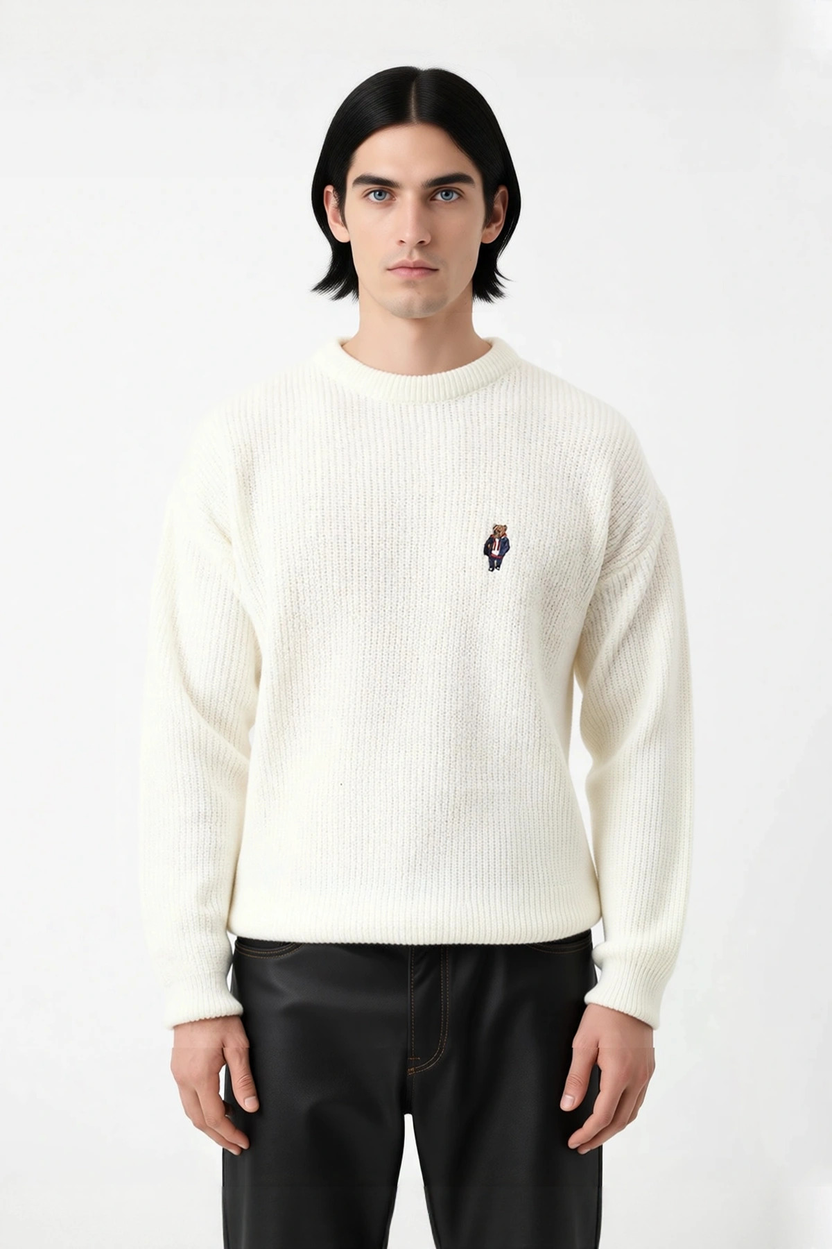 Erkek Oversize Geniş Kesim Bisiklet Yaka Ayı Nakışlı Selanik Dokuma Uzun Kol Kazak Kaliteli