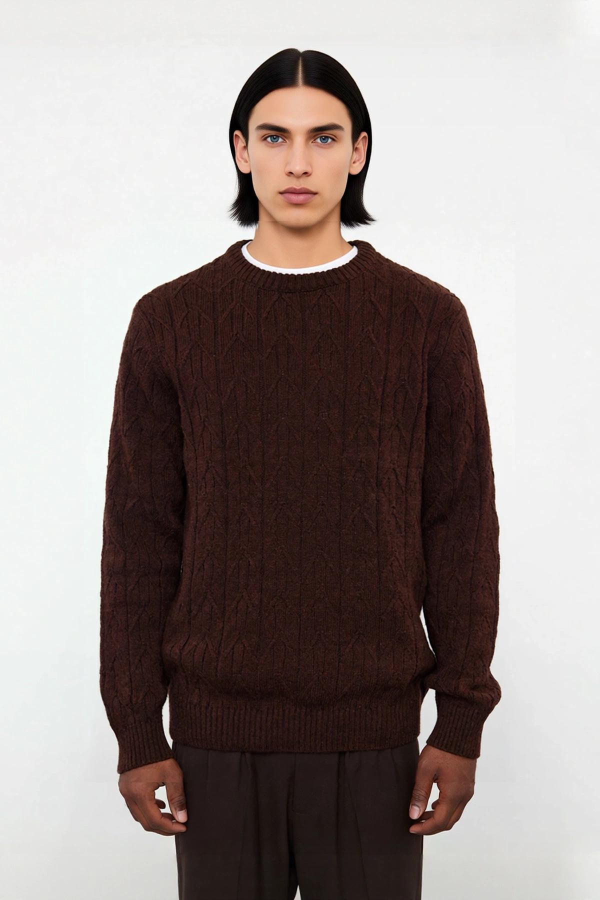 Ürün Özellikleri: Regular kalıp, %60 akrilik %40 polyester materyal, dokulu desen, bisiklet yaka, standart kol, triko kumaş, kahverengi renk, ince kalınlık.