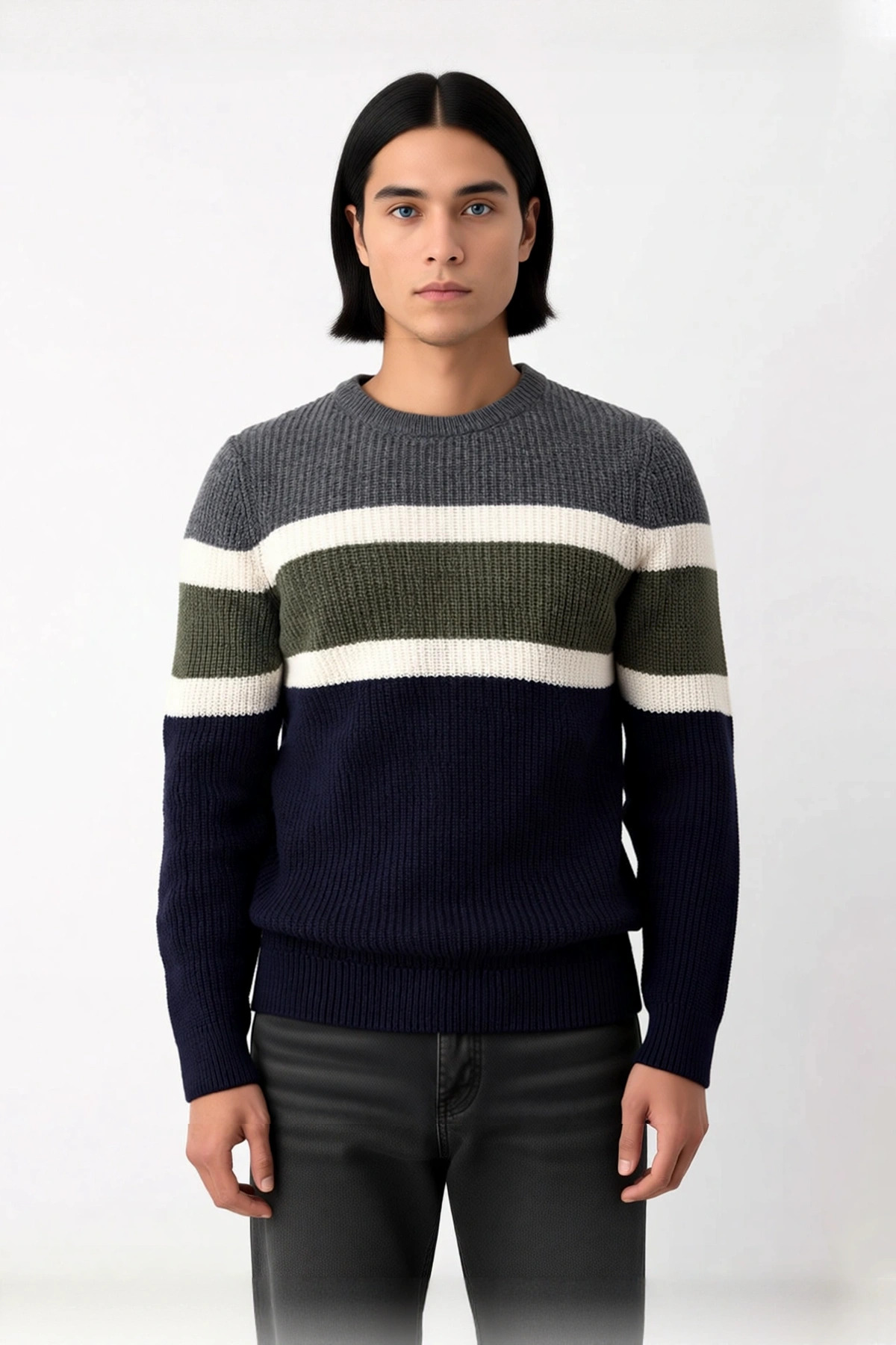 Ürün Özellikleri: Fitted kalıp, akrilik polyester yün karışımı materyal, renk bloklu desen, bisiklet yaka, standart kol, triko kumaş, gri lacivert yeşil beyaz renk, baskısız tasarım.