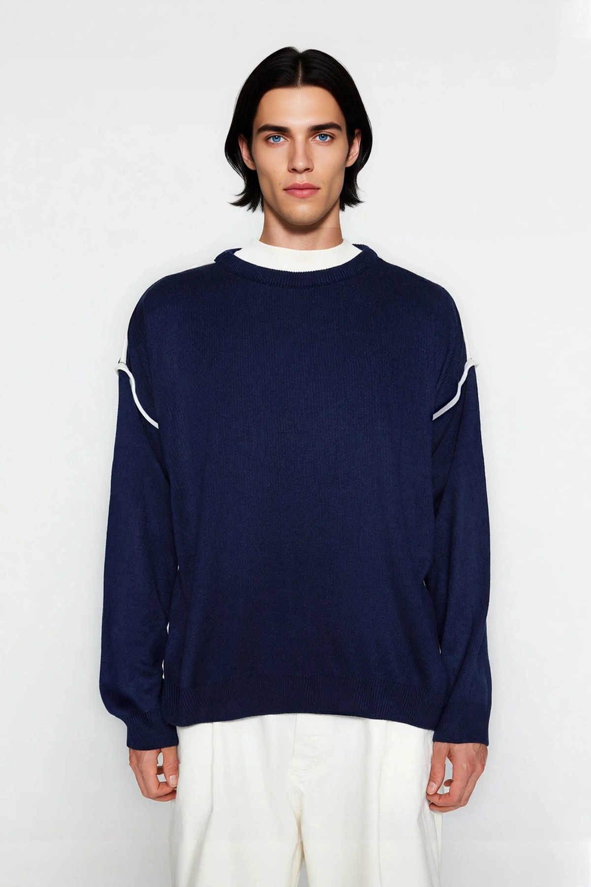 Ürün Özellikleri: Oversize kalıp, akrilik materyal, düz desen, bisiklet yaka, standart kol, triko kumaş, lacivert renk, baskısız tasarım.