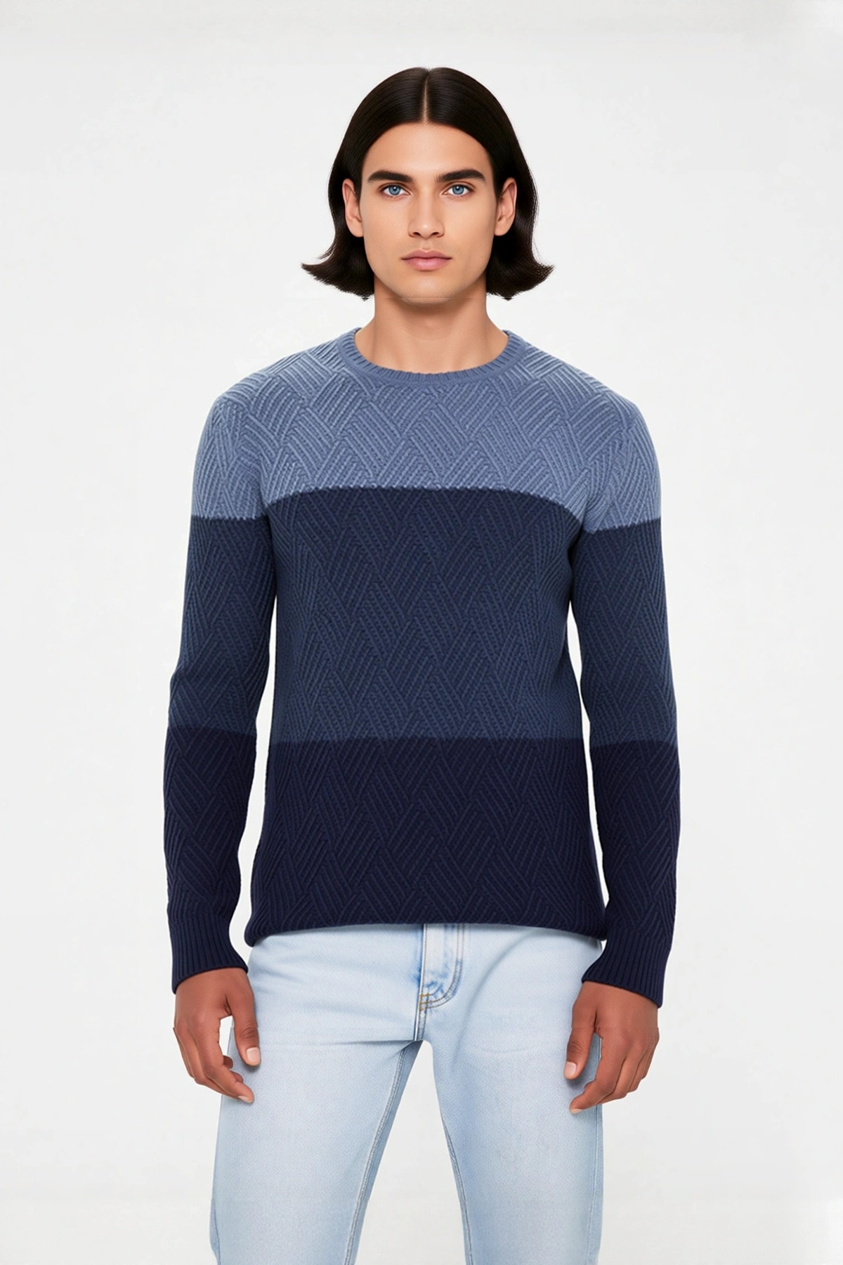 Ürün Özellikleri: Regular kalıp, %100 akrilik materyal, renk bloklu desen, bisiklet yaka, standart kol, triko kumaş, lacivert renk, cepsiz, uzun kol boyu, basic siluet, regular boy.
