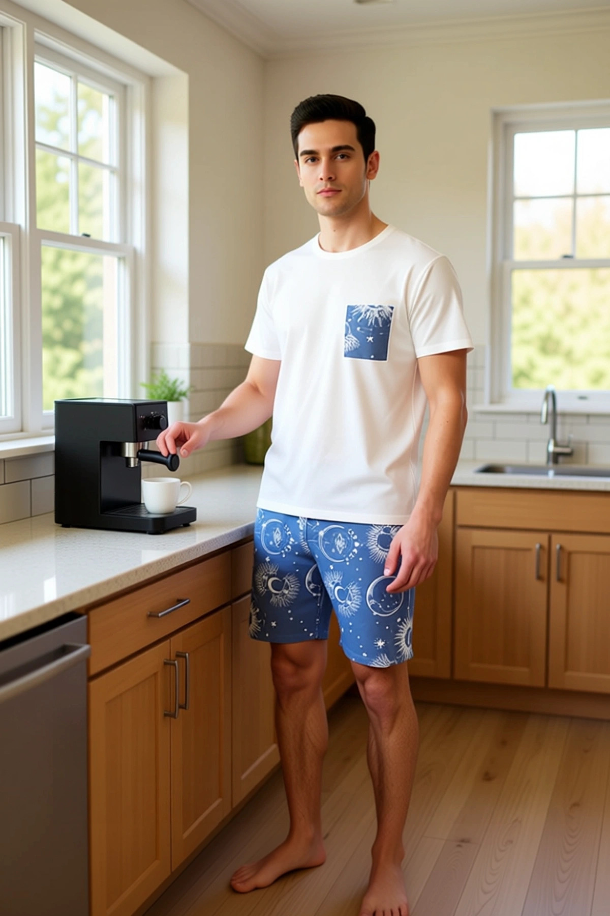 Bu erkek pijama seti, ev giyiminde konforu ve estetiği bir araya getiriyor. Üst kısımda yer alan bisiklet yaka ve kısa kollu t-shirt, basic bir tasarıma sahip olup, sol göğüs cebindeki ekru zemin üzerine işlenmiş mavi galaksi baskısı ile dikkat çekiyor. Bu baskı, takıma sofistike bir dokunuş katıyor. Alt kısımda ise, rahat bir kullanım sunan lastikli bel ve boru paça kesimli şortlar bulunuyor. Şortların tamamını kaplayan detaylı galaksi, ay ve yıldız desenleri, sete dinamik ve modern bir görünüm kazandırıyor. %100 pamuk kumaş, cildinize nazik davranarak gün boyu süren bir nefes alabilirlik ve yumuşaklık sağlıyor. Süprem dokuma tipi, kumaşın formunu korumasına ve dayanıklılığını artırmasına yardımcı oluyor. Bu ürün, cool ve comfort felsefesiyle uyumlu olarak lounge ve ev ortamları için özel olarak tasarlandı. Metraj baskı tekniği, desenlerin canlılığını ve kalıcılığını güvence altına alıyor. Regular fit kalıbı, hareket özgürlüğünüzü ön planda tutarken, örme kumaşın esnekliği vücudunuza uyum sağlıyor. Bisiklet yaka, zamansız bir stil sunarken, standart kesim kısa kollar sıcak günlerde ferahlık sağlıyor. Şortların normal bel ve boru paça kesimi, günün her anında maksimum konforu garanti ediyor. Bu pijama seti, evde geçirdiğiniz zamanı daha keyifli ve rahat hale getirmek için özenle hazırlandı. Yumuşak dokusu ve hafifliği sayesinde kendinizi özgür ve rahat hissedeceksiniz. Günlük aktivitelerinizde veya dinlenme anlarınızda tercih edebileceğiniz bu set, hem şık hem de işlevsel bir seçenek sunuyor. Ürün, sağlam dikişleri ve titiz işçiliği ile uzun süreli bir kullanım vadediyor. Yaz ayları için ideal bir seçim olan bu pijama seti, evde rahatlığından ödün vermek istemeyen erkekler için mükemmel bir alternatif. Bu seti, rahat bir terlik veya spor ayakkabı ile tamamlayarak ev içinde şık bir görünüm elde edebilirsiniz. Ürünün bakımı oldukça basittir; düşük sıcaklıkta makinede yıkanabilir ve ütülenebilir. Doğal liflerden üretilmiş olması, cildinizle dost bir kullanım sunar. Türkiye’de üretilmiştir ve yüksek kalite standartlarına uygun olarak tasarlanmıştır.