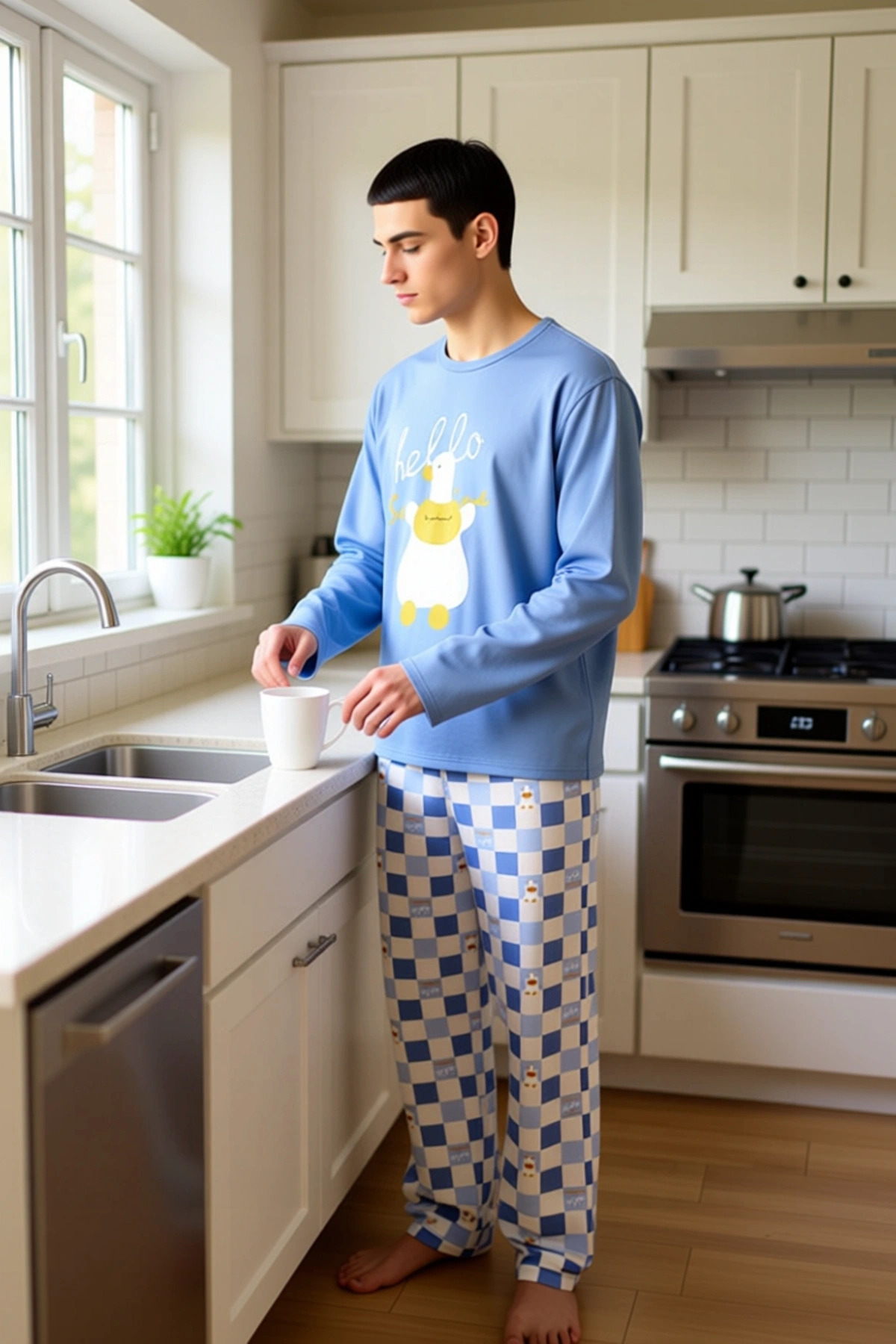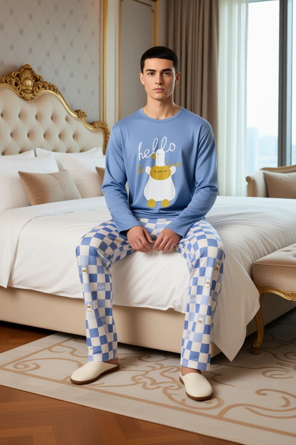 Erkekler için tasarlanan bu uzun kollu pijama takımı, evdeki rahatlığınızı bir üst seviyeye taşıyor. Üst kısımda yer alan sevimli ördek baskısı ve ‘hello’ yazısı, takıma eğlenceli bir dokunuş katarken, alt kısımdaki mavi ve krem tonlarındaki ekose desen, klasik bir görünüm sunuyor. %95 pamuk ve %5 elastan içeren özel kumaş karışımı, hem yumuşaklığı hem de esnekliği bir araya getirerek gün boyu üstün bir konfor sağlıyor. Pamuğun doğal nefes alabilirliği, cildinizin rahat etmesini sağlarken, elastan sayesinde hareketleriniz kısıtlanmaz. Bu pijama takımı, soğuk kış gecelerinde sizi sıcak tutacak şekilde tasarlanmıştır. Erkeklerin günlük ev giyiminde aradığı hem şıklığı hem de rahatlığı bir arada sunan bu ürün, dolabınızın vazgeçilmez parçalarından biri olacak. Standart kol kesimi ve bisiklet yaka detayı, bu pijama takımına zamansız bir stil kazandırıyor. Regular kalıbı, vücuda tam oturarak rahat bir kullanım sunarken, uzun kollu üst ve boru paça pantolon, kış ayları için ideal bir sıcaklık sağlıyor. Süprem kumaş dokusu, pijama takımının yumuşaklığını ve dayanıklılığını artırarak uzun süreli kullanım imkanı sunuyor. Elastan içeriği, kumaşın esnekliğini artırarak uyku sırasında veya evde dinlenirken hareket özgürlüğünüzü maksimize ediyor. Bu pijama takımı, sadece uyku için değil, aynı zamanda evde geçirilen zamanlarda da şık ve rahat hissetmek isteyen erkekler için mükemmel bir tercih. Tasarımındaki detaylar, hem göze hitap ediyor hem de konforu ön planda tutuyor. Kış mevsiminin soğuk günlerinde sıcak ve konforlu bir seçenek sunan bu pijama takımı, evde geçirdiğiniz zamanları daha keyifli hale getirecek. Kot pantolon veya rahat bir jogger ile kombinleyerek ev dışında da rahat bir görünüm yakalayabilirsiniz. Ayakkabı olarak spor ayakkabılar veya ev terlikleri tercih edilebilir. Ürünün bakımı oldukça pratiktir; makinede yıkanabilir ve düşük ısıda ütülenebilir. Bu sayede pijama takımınızın kalitesini ve görünümünü uzun süre koruyabilirsiniz. Bu pijama takımı, hem kendiniz için hem de babanız, kardeşiniz veya arkadaşınız gibi erkek sevdikleriniz için harika bir hediye seçeneği olacaktır.