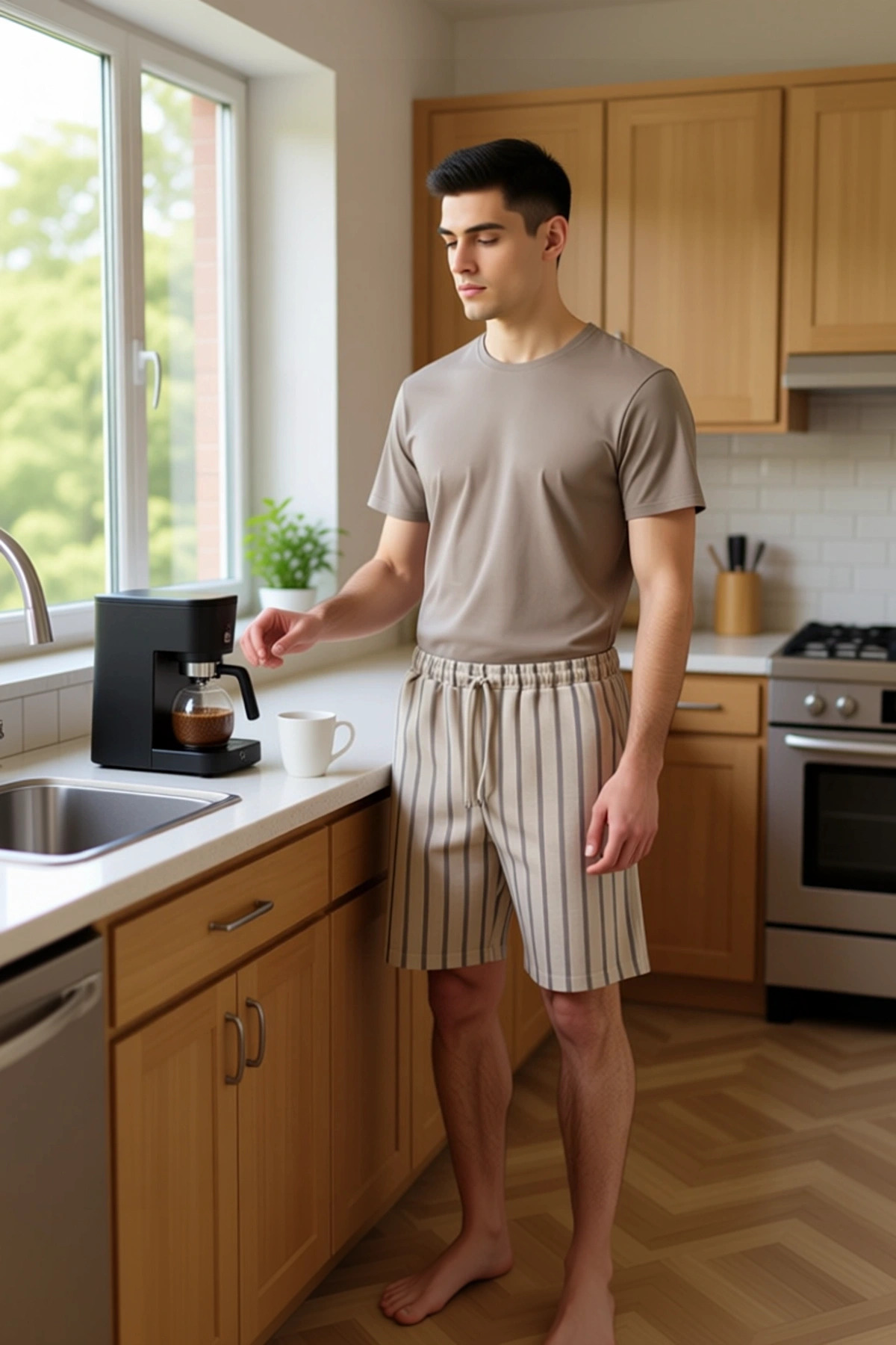 Bu erkek pijama takımı, %54 polyester ve %46 pamuk karışımıyla üretilmiş olup, waffle dokusu sayesinde hem yumuşak hem de nefes alabilen bir yapıya sahiptir. Bej rengi ve zarif çizgili deseni, takıma modern ve şık bir görünüm kazandırır. Regular fit kalıbı, her vücut tipine uyum sağlayarak gün boyu maksimum konfor sunar. Bisiklet yaka ve kısa kollu üst, rahat bir kullanım sağlarken, boru paça şortlar da hareket özgürlüğünüzü kısıtlamaz. Bu takım, evde dinlenirken veya uyurken tercih edebileceğiniz ideal bir seçenektir. Cool ve konforlu persona ile tasarlanan bu ürün, ev giyiminde stil sahibi erkekler için öne çıkıyor. Üst kısmın bisiklet yaka detayı, boyun bölgesinde rahatsızlık yaratmadan şık bir görünüm sunar. Kısa kolları, özellikle yaz aylarında serin kalmanıza yardımcı olur. Regular fit kesimi, vücuda tam oturarak hem rahatlık hem de estetik bir duruş sağlar. Şortların boru paça tasarımı, hafifliği ve kullanım kolaylığı ile dikkat çeker. Çizgili desen, takıma dinamik bir hava katarken, waffle dokusu kumaşa hoş bir derinlik ve dokusal zenginlik ekler. Bu pijama takımı, evde geçirilen zamanı daha keyifli hale getirmek için özel olarak tasarlanmıştır. Yumuşak kumaşı cildinize nazikçe dokunur ve gün boyu kendinizi iyi hissetmenizi sağlar. Bu ürün, günlük kullanım için tasarlanmış olup, rahatlığı ön planda tutan erkekler için vazgeçilmez bir parçadır. Yaz mevsimi için mükemmel bir seçim olan bu pijama takımı, hafif ve nefes alabilen yapısıyla sıcak günlerde bile serin kalmanızı sağlar. Bu takımı, rahat bir çift terlik veya spor ayakkabı ile kombinleyerek ev içinde şık bir görünüm elde edebilirsiniz. Ayrıca, hafta sonu evde dinlenirken veya kısa bir yürüyüşe çıkarken de bu takımı tercih edebilirsiniz. Takımın bakımı oldukça pratiktir; makinede yıkanabilir ve düşük ısıda ütülenebilir. Bu sayede pijama takımınızın ömrünü uzatabilir ve her zaman ilk günkü gibi yeni görünmesini sağlayabilirsiniz. Bu ürün, hem konfor hem de stil arayan erkekler için harika bir seçenektir.