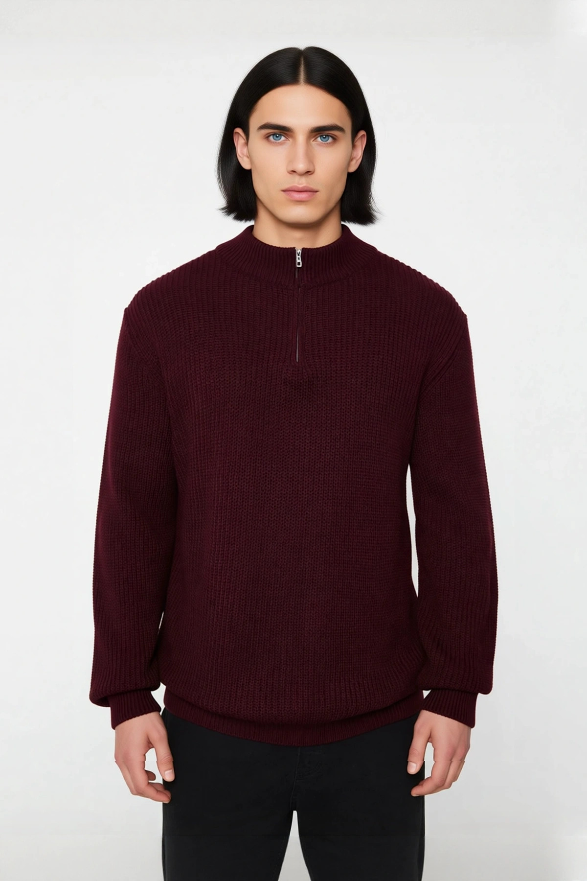 Ürün Özellikleri: Regular kalıp, akrilik materyal, düz desen, dik yaka, standart kol, triko kumaş, bordo renk.