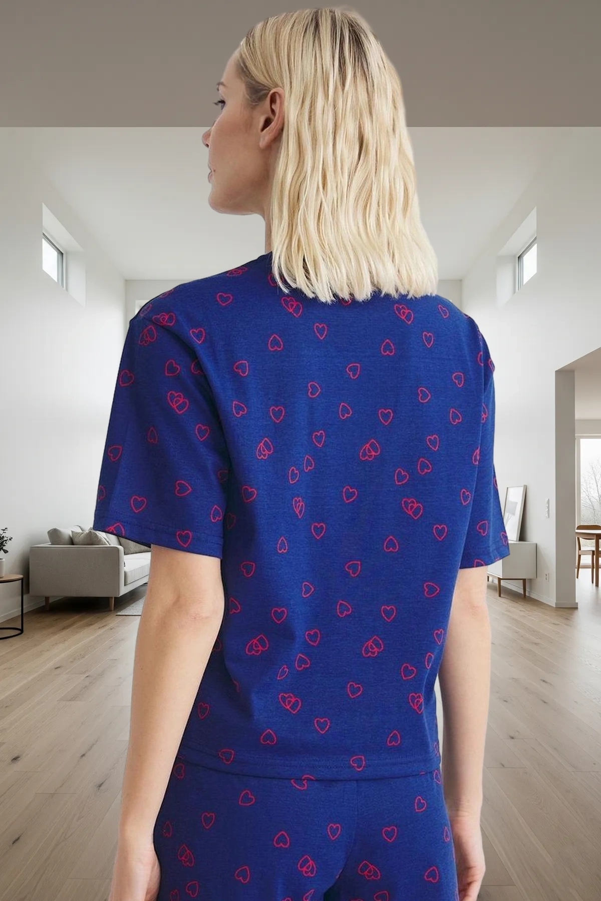 Nefes alabilen pamuk kumaşı sayesinde yaz aylarında da rahatlıkla kullanabileceğiniz bu pijama takımı, hem kaliteli hem de dayanıklıdır. Metraj baskı tekniği ile yapılan kalpli desen, solma yapmaz ve uzun süre canlılığını korur. Regular kalıbı, vücudunuza tam otururken, hareket özgürlüğünüzü kısıtlamaz. Boru paça şort rahatlığını sunarken, normal bel yapısı ile konforlu bir kullanım sağlar.