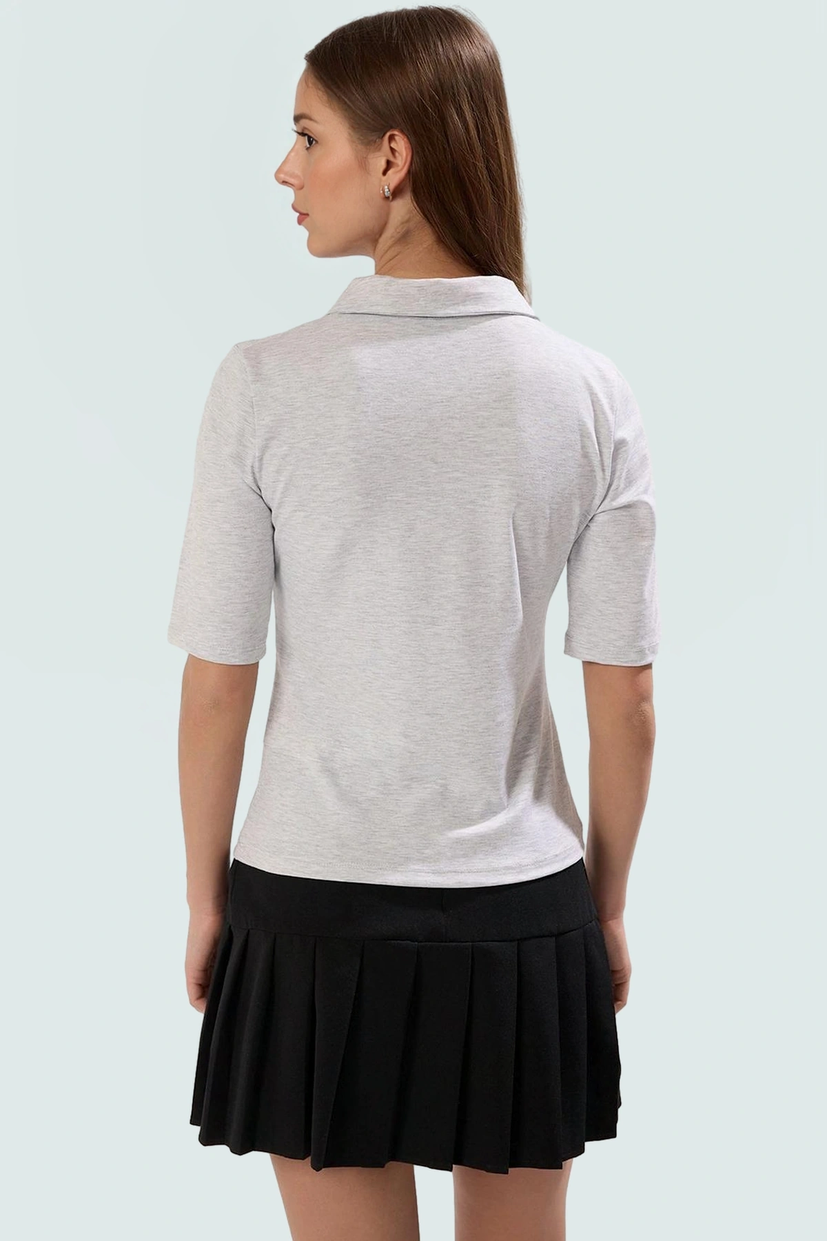 Gri melenj rengi, her türlü alt giyim ile kolayca kombinlenebilen çok yönlü bir renk. Jean pantolon, etek, şort farketmez, her zaman şık ve modern görünmenizi sağlar. Bluzun regular boyu ve rahat kalıbı sayesinde her vücut tipine uyum sağlar. Truva kolları sıcak havalarda serin kalmanıza, polo yakası ise şık ve zarif bir görünüm elde etmenize yardımcı olur.