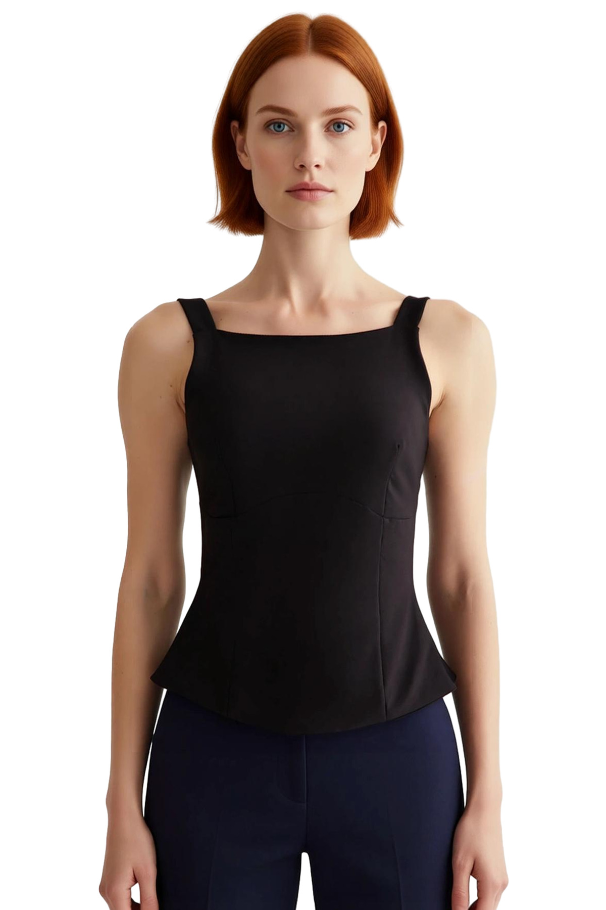 Yaz aylarında şıklığı ve rahatlığı bir arada arayanlar için ideal bir seçim olan bu siyah bluz, dokuma kumaşından üretilmiş olup, nefes alabilir ve hafif bir yapıya sahiptir. Fitted kalıbıyla vücuda mükemmel oturan bluz, kayık yakası ve kolsuz tasarımı ile hem modern hem de zamansız bir stil sunar. Arka kısımda yer alan üç adet fiyonk detayı ise bluza özgün ve dikkat çekici bir hava katar. Günlük hayatta jeanler ve şortlarla veya özel davetlerde etek ve pantolonlarla rahatlıkla kombinleyebilirsiniz.