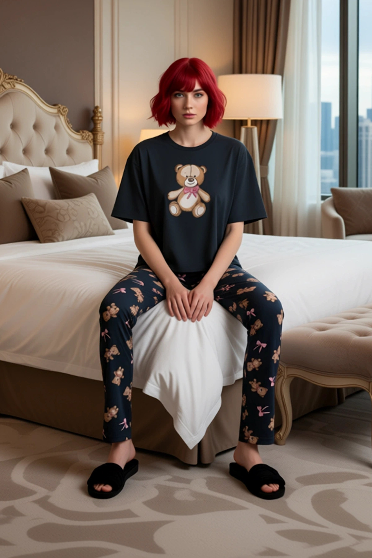 Bu genç ve enerjik pijama takımı, genç kadınların ev giyiminde tercih edebileceği şık ve rahat bir seçenektir. Antrasit rengi zemin üzerine yerleştirilmiş sevimli ayıcık ve kurdele fiyonk baskısı, takıma neşeli bir hava katmaktadır. %96 pamuk ve %4 elastan karışımı, kumaşa hem yumuşaklık hem de esneklik kazandırır. Bu sayede cilt nefes alabilir ve gün boyu süren bir konfor sağlanır. Penye süprem örme kumaş, dokusuyla da fark yaratır, yumuşaklığı sayesinde rahat bir kullanım sunar. Regular kalıp, genç vücut yapısına uyum sağlayarak hareket özgürlüğünü kısıtlamaz. Bu pijama takımı, gençlerin hem dinlenirken hem de evde vakit geçirirken kendilerini iyi hissetmelerini sağlayacak şekilde tasarlanmıştır. Takımın üst kısmı bisiklet yaka ve kısa kolludur, bu da serin havalarda bile rahatlık sunar. Pantolon kısmı ise uzun ve boru paçadır, bu sayede hareketler kısıtlanmaz ve rahat bir uyku veya dinlenme pozisyonu sağlanır. Likralı örme yapısı, kumaşın vücuda nazikçe oturmasını ve esnekliğini korumasını sağlar. Normal bel kesimi, pantolonun belde rahatça durmasını ve kaymamasını garanti eder. Bu detaylar, pijama takımının hem estetik hem de fonksiyonel açıdan gençlerin beklentilerini karşılamasını hedefler. Günlük yaşamın içinde konforu ve stili bir araya getiren bir tasarımdır. Bu pijama takımı, ilkbahar ve sonbahar gibi geçiş mevsimlerinde rahatlıkla kullanılabilir. Günlük kullanımda, tayt veya rahat bir eşofman altı ile kombinlenerek ev içinde şık bir görünüm elde edilebilir. Evde dinlenirken ise, yumuşak çoraplarla tamamlanarak maksimum rahatlık sağlanabilir. Takımın bakımı oldukça basittir; makinede yıkanabilir ve düşük ısıda ütülenebilir, bu da uzun süreli kullanım için pratiklik sunar. Bu pijama takımı, genç kadınlar için hem sevimli hem de kullanışlı bir ev giyim seçeneğidir.