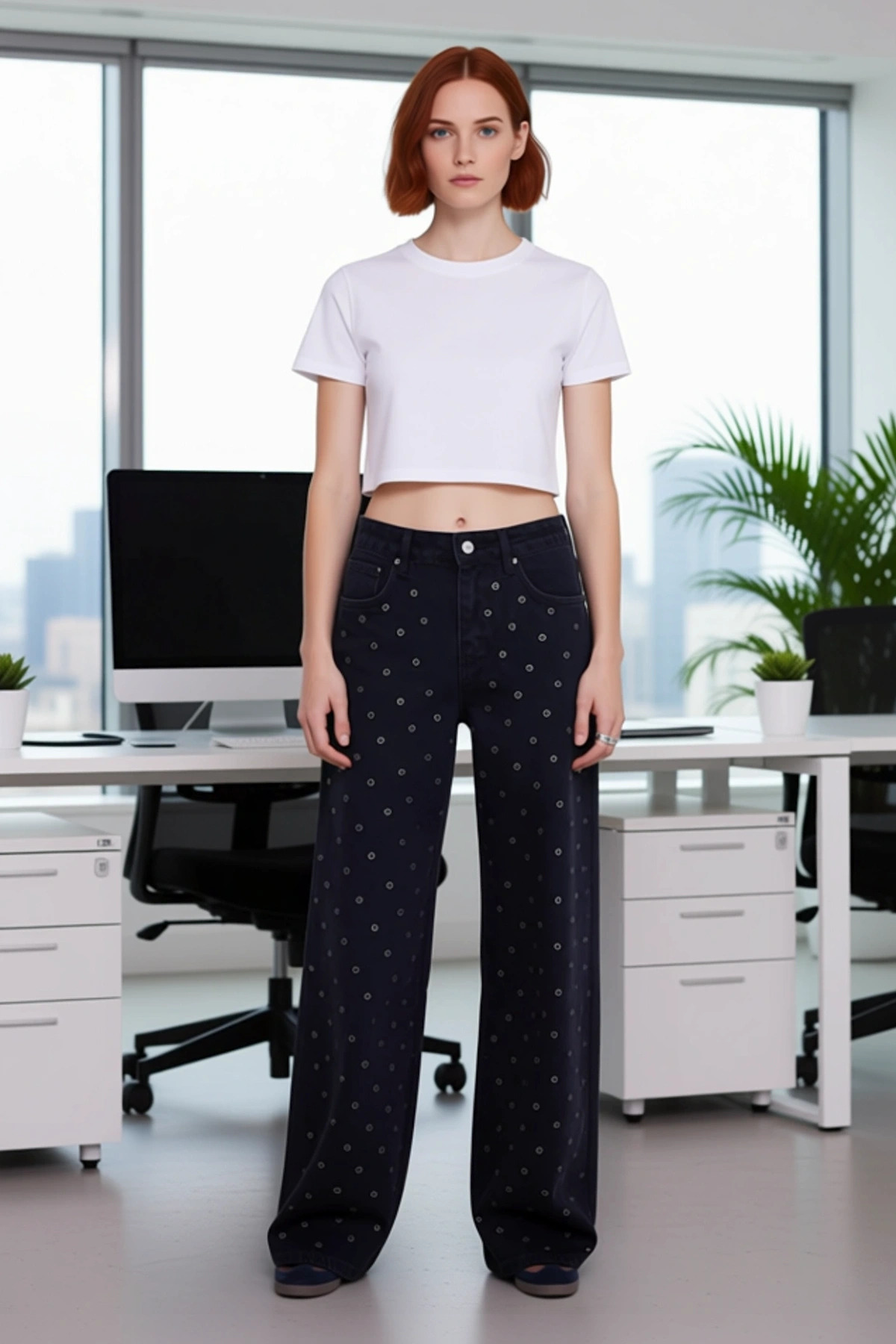 Genç kadınların dinamik ve stil sahibi dünyasına hitap eden bu siyah kot pantolon, üzerindeki zarif kuşgözü desenleriyle fark yaratıyor. %100 pamuktan üretilmiş olup, cildinize dost ve nefes alabilen bir yapı sunar. Rigid denim kumaşı, pantolonun formunu koruyarak uzun süreli kullanım vadediyor. Yüksek bel ve geniş paça kesimi, modern bir silüet oluştururken aynı zamanda maksimum konfor sağlıyor. Düz deseni ve sade dokuma tipi, pantolonun üzerindeki kuşgözü detaylarının daha belirgin olmasını sağlıyor. Bu pantolon, günlük şıklığı ve rahatlığı bir arada arayan genç kadınlar için ideal bir seçimdir. Bu pantolonun tasarımında yüksek bel detayı, günümüz modasının öne çıkan unsurlarından biri olarak yer alıyor. Geniş paça kesimi ise rahat hareket etme imkanı sunarak gün boyu konfor sağlıyor. Yaka ve kol detayları bulunmayan bu ürün, sade ve şık bir görünüm sunuyor. %100 pamuk içeriği, kumaşın yumuşaklığını ve nefes alabilirliğini garanti ediyor. Rigit denim dokusu, pantolonun zamansız bir parça olmasını destekliyor. Bu pantolon, gençlerin enerjisine ve stil anlayışına uygun olarak tasarlanmıştır. Bu geniş bacak kot pantolon, her mevsim için uygun bir seçenektir. İlkbaharda hafif bir kazak veya sweatshirt ile, yazın ise basic bir tişört veya askılı bluz ile rahatlıkla kombinlenebilir. Sonbahar ve kış aylarında ise kalın bir kazak veya hırka ile tamamlanarak sıcak ve şık bir görünüm elde edilebilir. Bu pantolonu, sneakerlar, botlar veya platform ayakkabılar ile kombinleyebilirsiniz. Beyaz bir sneaker ile spor bir görünüm yakalarken, siyah bir bot ile daha asi bir tarz yaratabilirsiniz. Bakımı için düşük sıcaklıkta ve ters çevirerek yıkama önerilir.