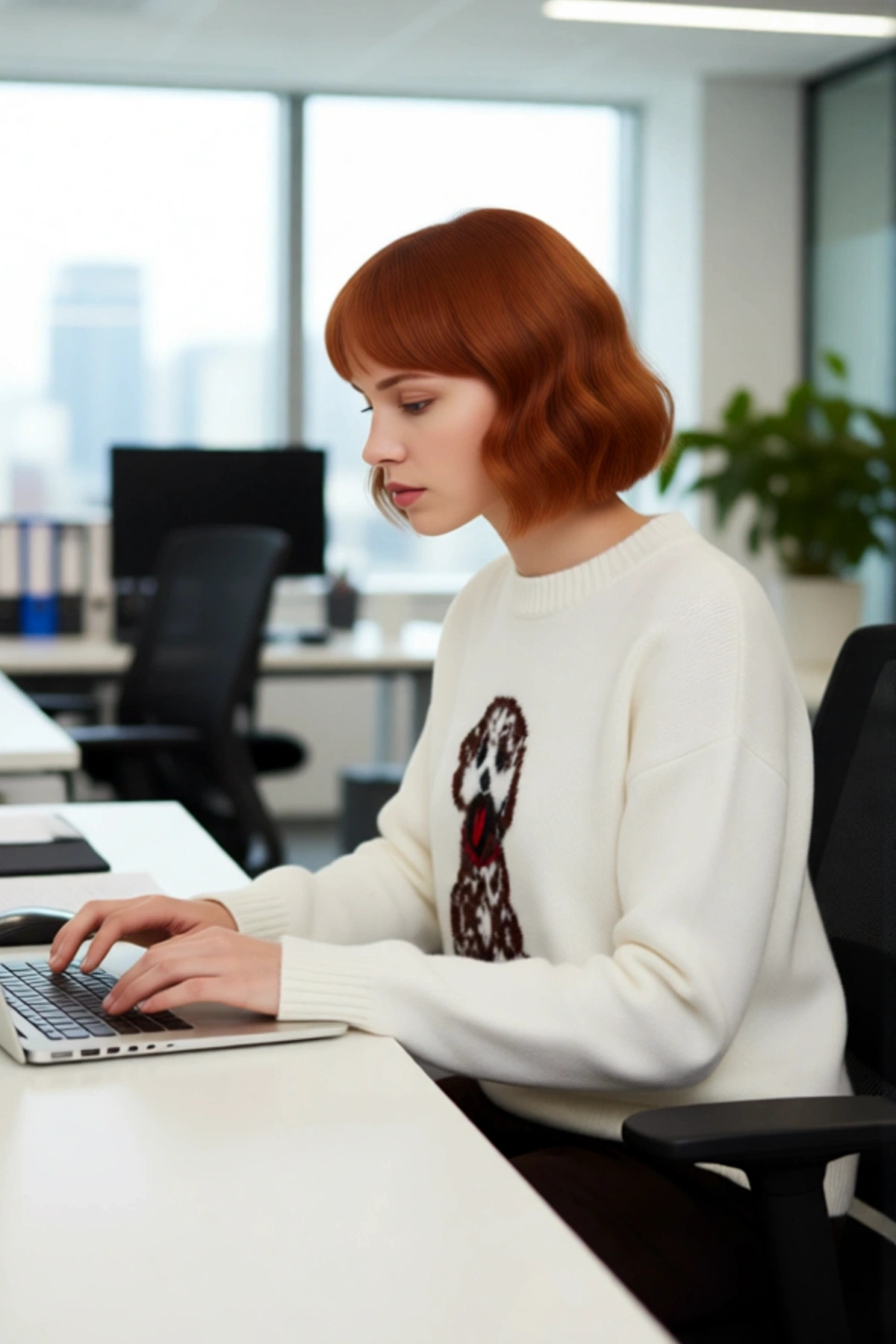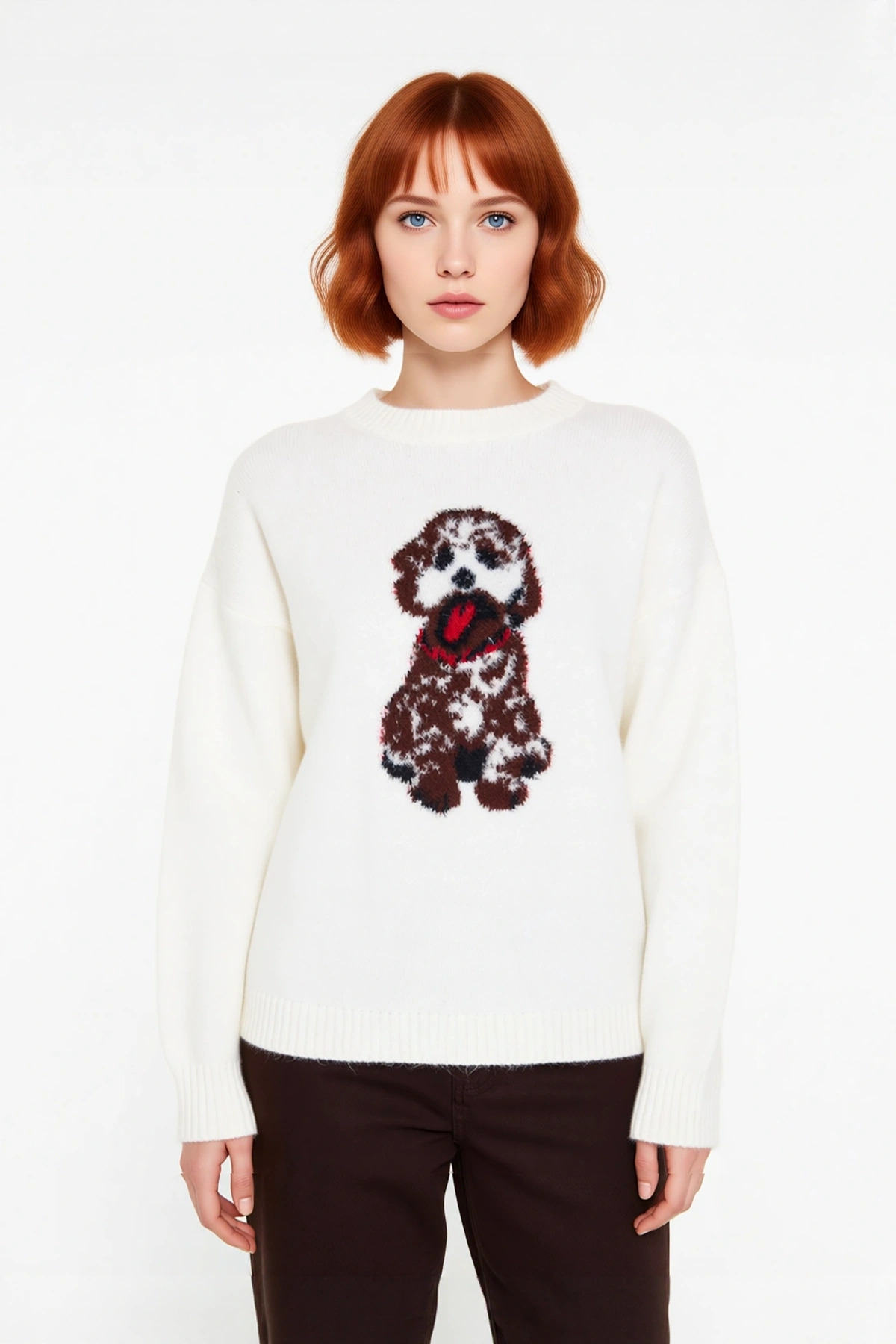 Genç Kadın Rahat Kesim İntersia Dokuma Köpek Nakışlı Bisiklet Yaka Triko Kazak Trend Stil Kaliteli