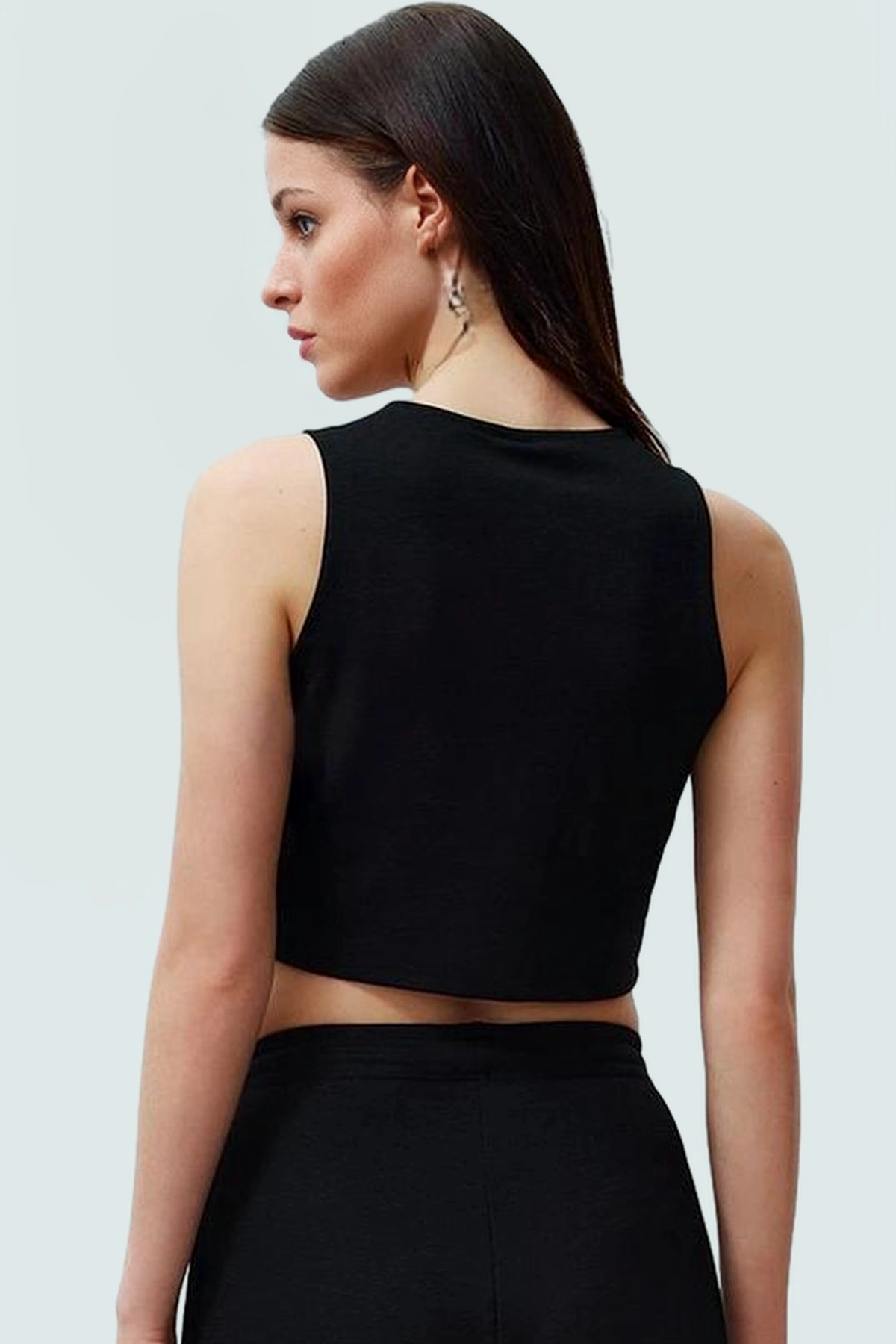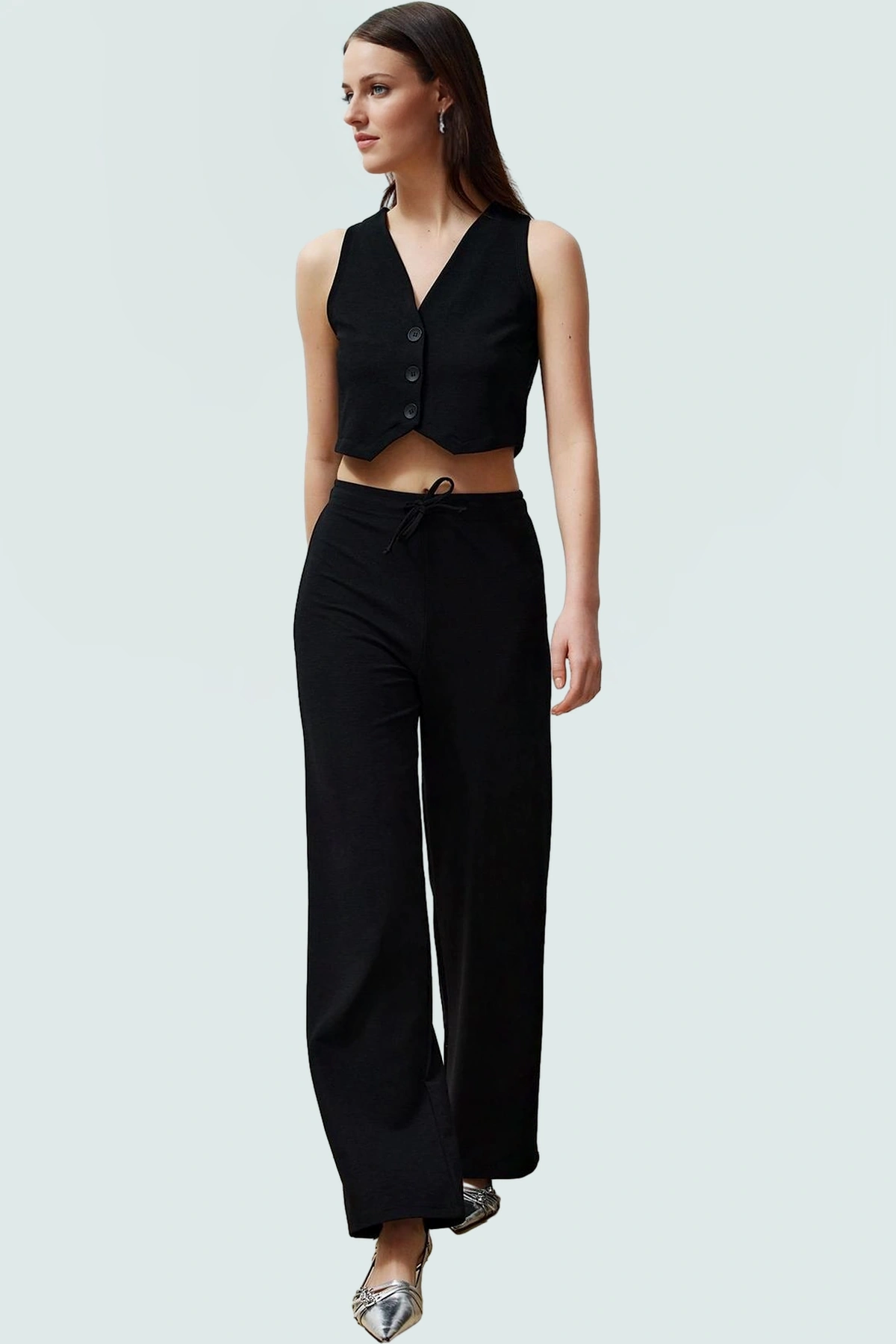Günlük yaşamınızda rahatlığı ve şıklığı bir arada sunan bu siyah takım, hem iş hem de günlük yaşam için mükemmel bir seçim. Geniş paça pantolonun rahat kesimi, gün boyu konfor sağlar. Fitted kalıp, vücut hatlarınızı zarifçe vurgulayarak şık bir görünüm sunar. Yüksek kaliteli polyester karışımlı örme kumaş, nefes alabilirliği ve dayanıklılığı bir arada sunar. Düğmeli V yaka yelek, takımın şıklığına ayrı bir hava katarken, bağlama detayı zarif bir dokunuş sağlar.
