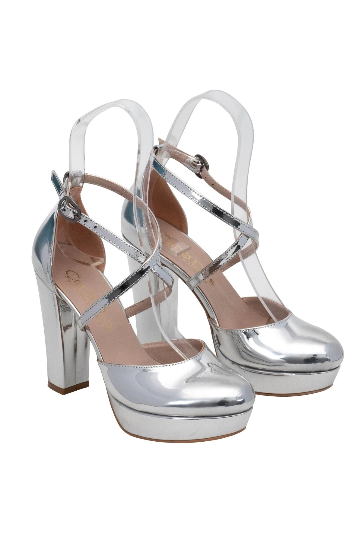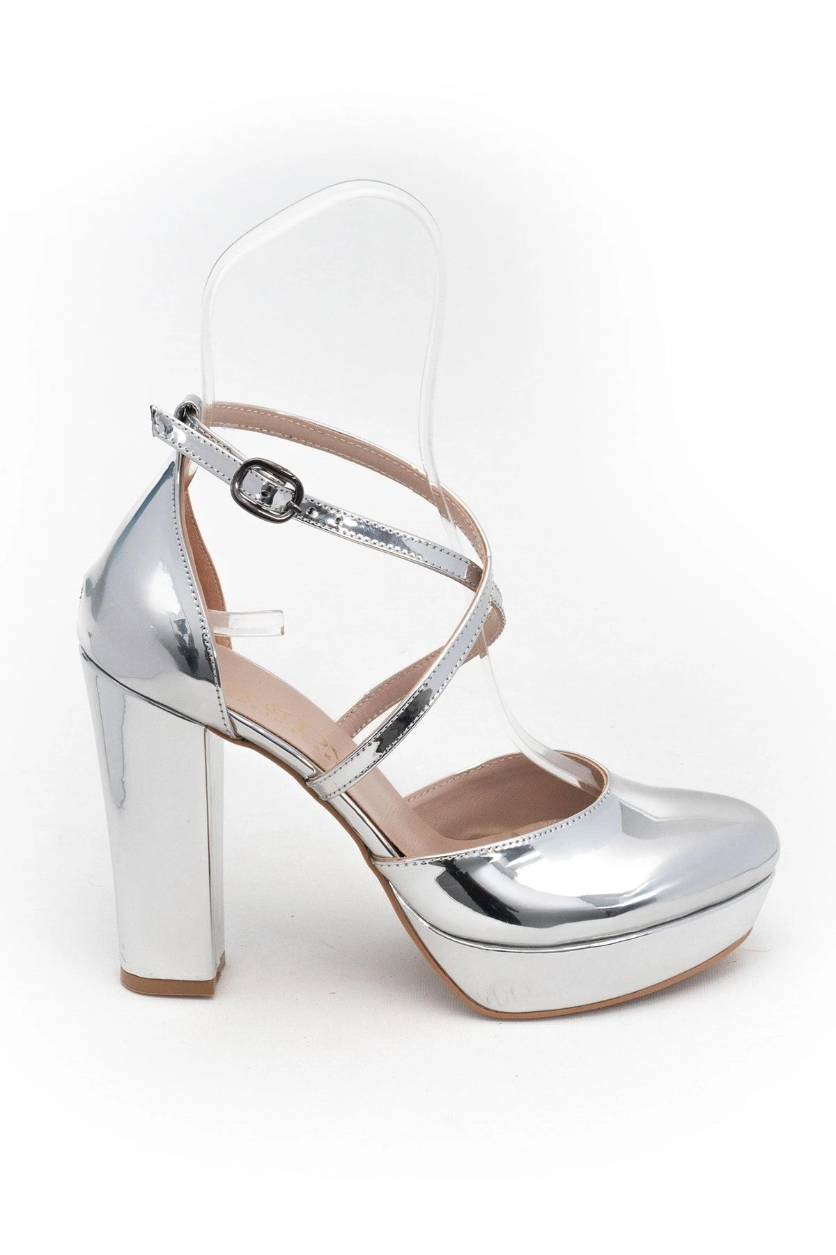 Zarif tasarımıyla dikkat çeken gümüş ayna kadın abiye ayakkabı, 10 cm ve üzeri yüksek topuk boyu ile şıklığınızı tamamlar.