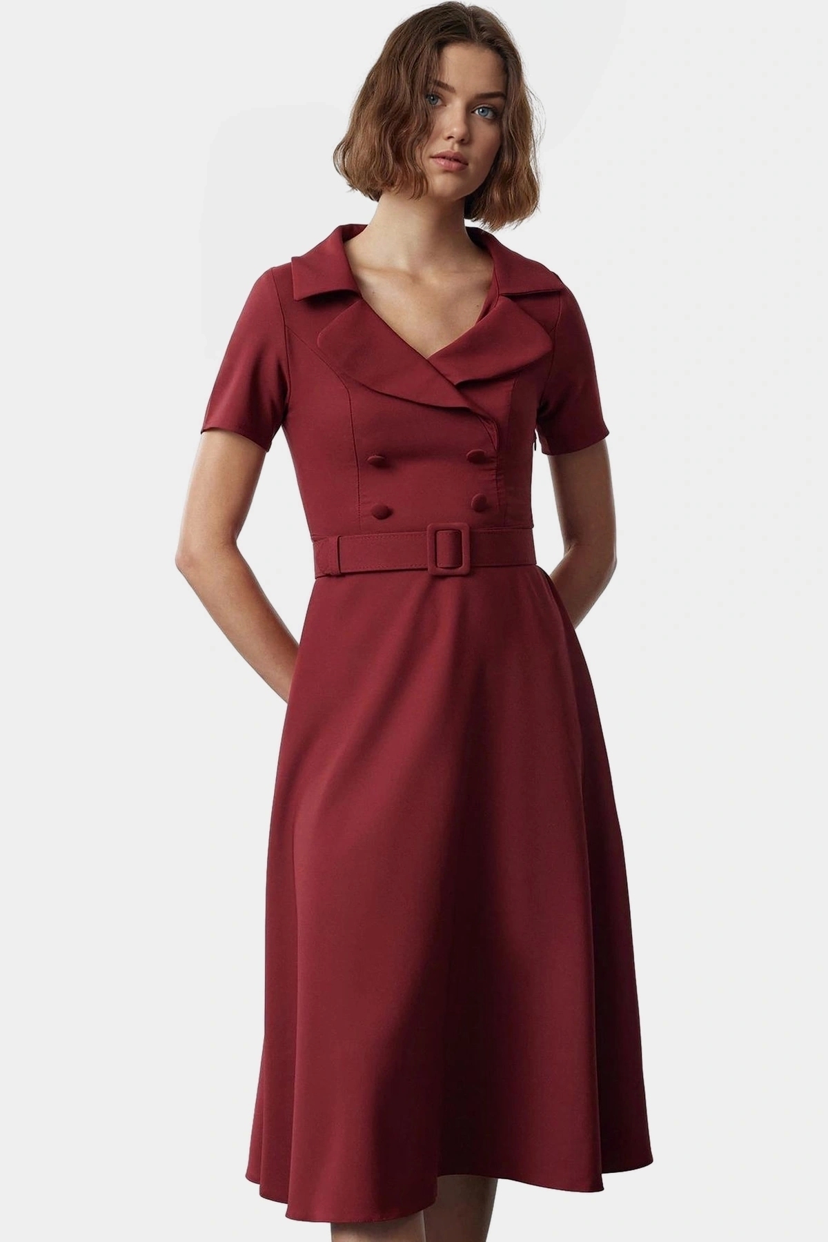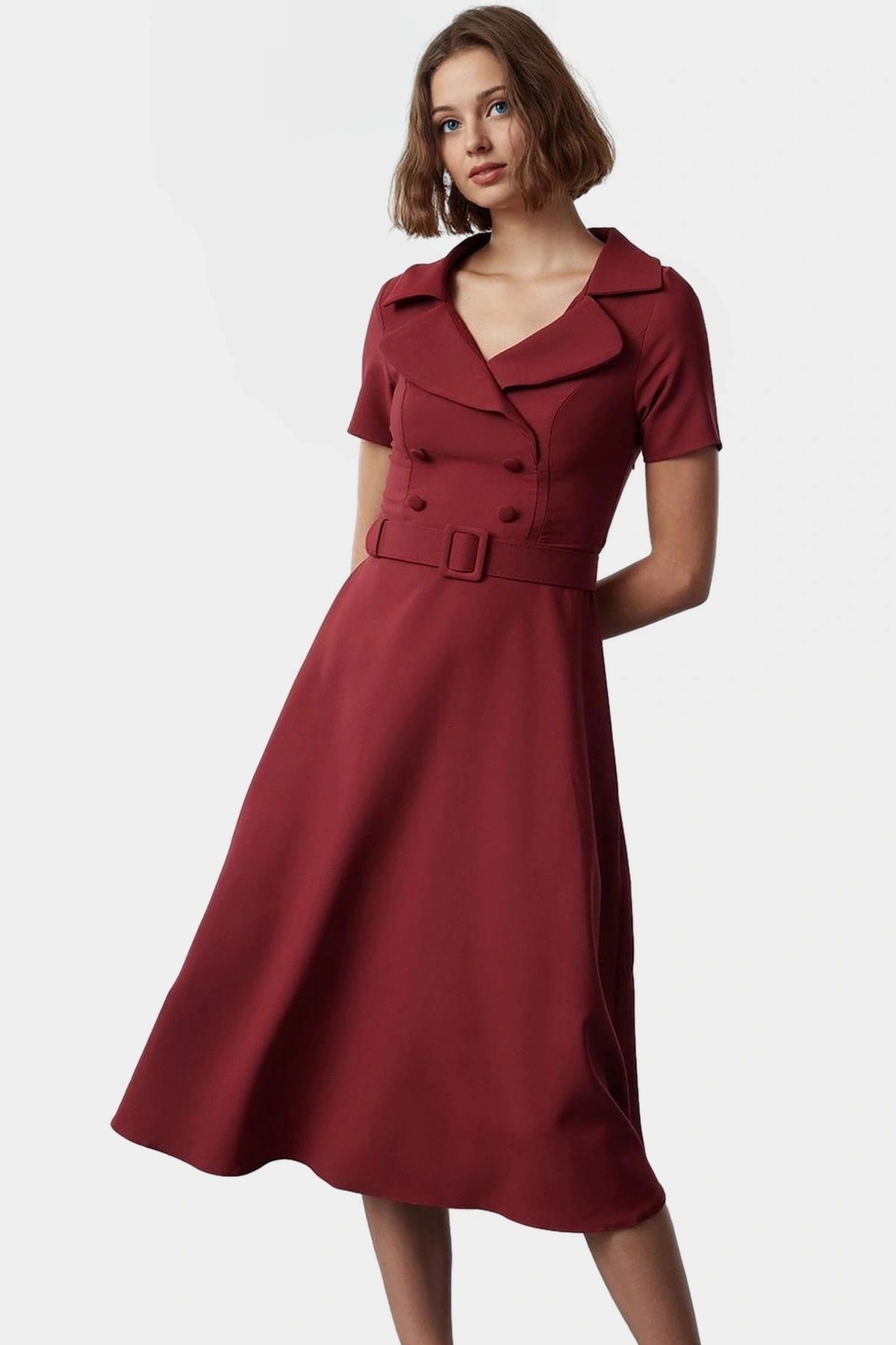 Profesyonel görünümünüzü tamamlayacak, kusursuz bir iş elbisesi arıyorsanız doğru yerdesiniz! Bordo rengi ve şık tasarımıyla dikkat çeken bu elbise, gün boyu kendinizi güvende ve rahat hissetmenizi sağlayacak. Yüksek kaliteli dokuma kumaştan üretilen elbise, nefes alabilir yapısıyla konfor sunar. Skater kalıbı, feminen bir siluet oluştururken, balon kolları modern bir dokunuş katıyor.
