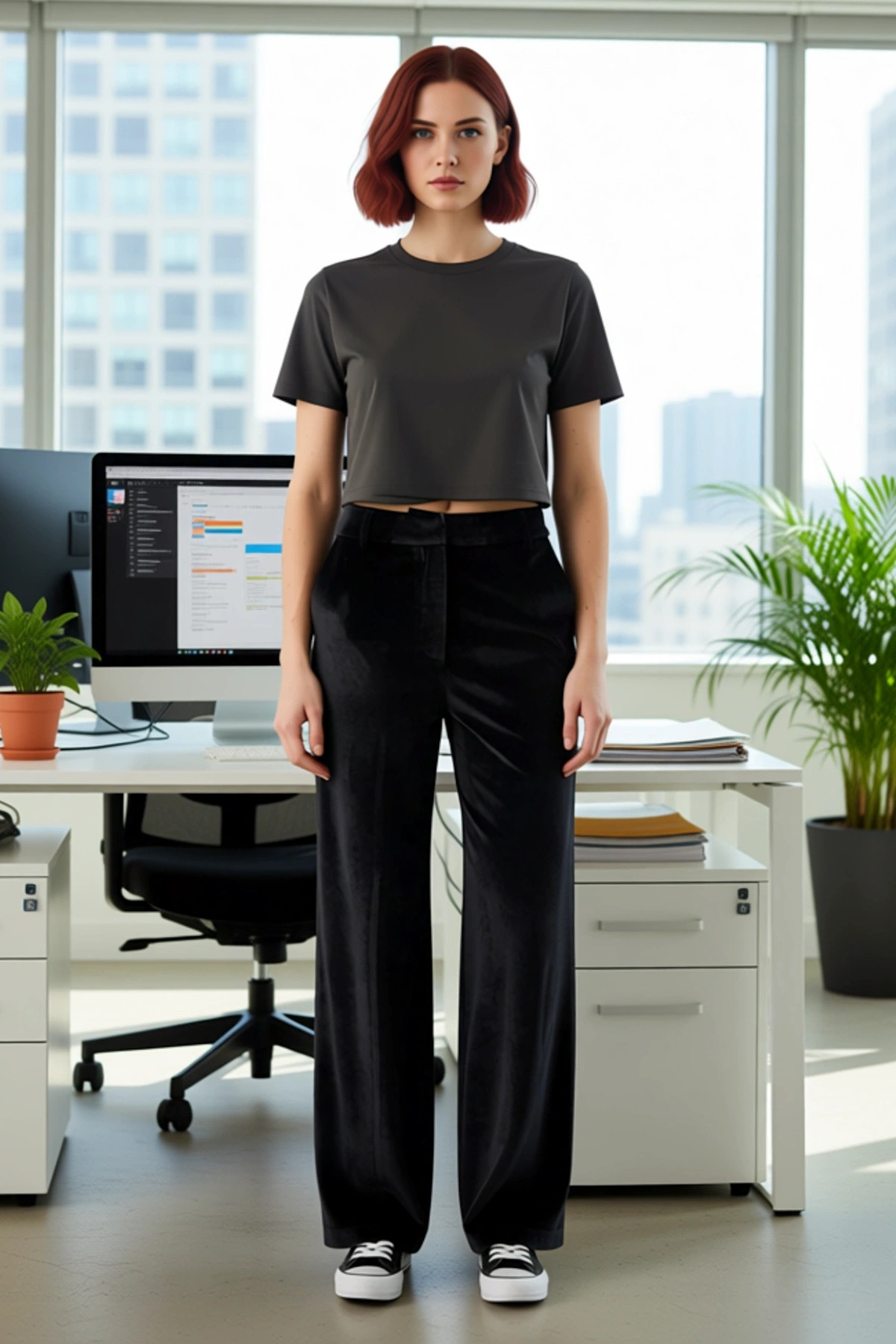 Bu kadın pantolonu, sofistike ve rahat bir stil arayanlar için özel olarak üretilmiştir. Dokuma kadife kumaşı, pantolona lüks bir görünüm ve yumuşak bir dokunuş katar. Geniş paça kesimi, modern ve şık bir siluet oluştururken, normal bel detayı gün boyu konfor sağlar. Düz deseni, pantolonu farklı üst giyim parçalarıyla kolayca eşleştirmenize olanak tanır. %100 polyester materyali, dayanıklılık ve kolay bakım avantajı sunar. Bu pantolon, hem günlük hem de özel günler için uygun olup, cool ve konforlu bir persona yansıtır. Kadife dokusu, özellikle soğuk havalarda sıcaklık ve zarafet sunar. Pantolonun wide leg kalıbı, rahat bir hareket imkanı sunarken, geniş paça tasarımı zarif bir akış sağlar. Normal bel yüksekliği, kullanıcısına maksimum konfor sunmak üzere tasarlanmıştır. Bu pantolon, şıklığından ödün vermek istemeyen ancak rahatlığa da önem veren kadınlar için ideal bir seçenektir. Kadife kumaşın eşsiz dokusu, giyim deneyimini bir üst seviyeye taşır. Günlük kullanımın yanı sıra, özel davetlerde de şık bir tercih olabilir. Bu pantolon, modern kadının gardırobunun temel taşlarından biri olacaktır. Bu zarif siyah kadife pantolon, kış mevsimi için mükemmel bir seçimdir. Üzerine saten bir bluz ve zarif topuklu ayakkabılarla tamamlayarak şık bir davet kombini oluşturabilirsiniz. Daha gündelik bir görünüm için, basic bir tişört ve sneakerlarla kombinleyebilirsiniz. Kalın triko bir kazak ve çizmelerle de kışa uygun bir stil yaratabilirsiniz. Kadife kumaşın bakımı için kuru temizleme tavsiye edilir. Bu pantolon, her kadının stilini zenginleştirecek bir parçadır.