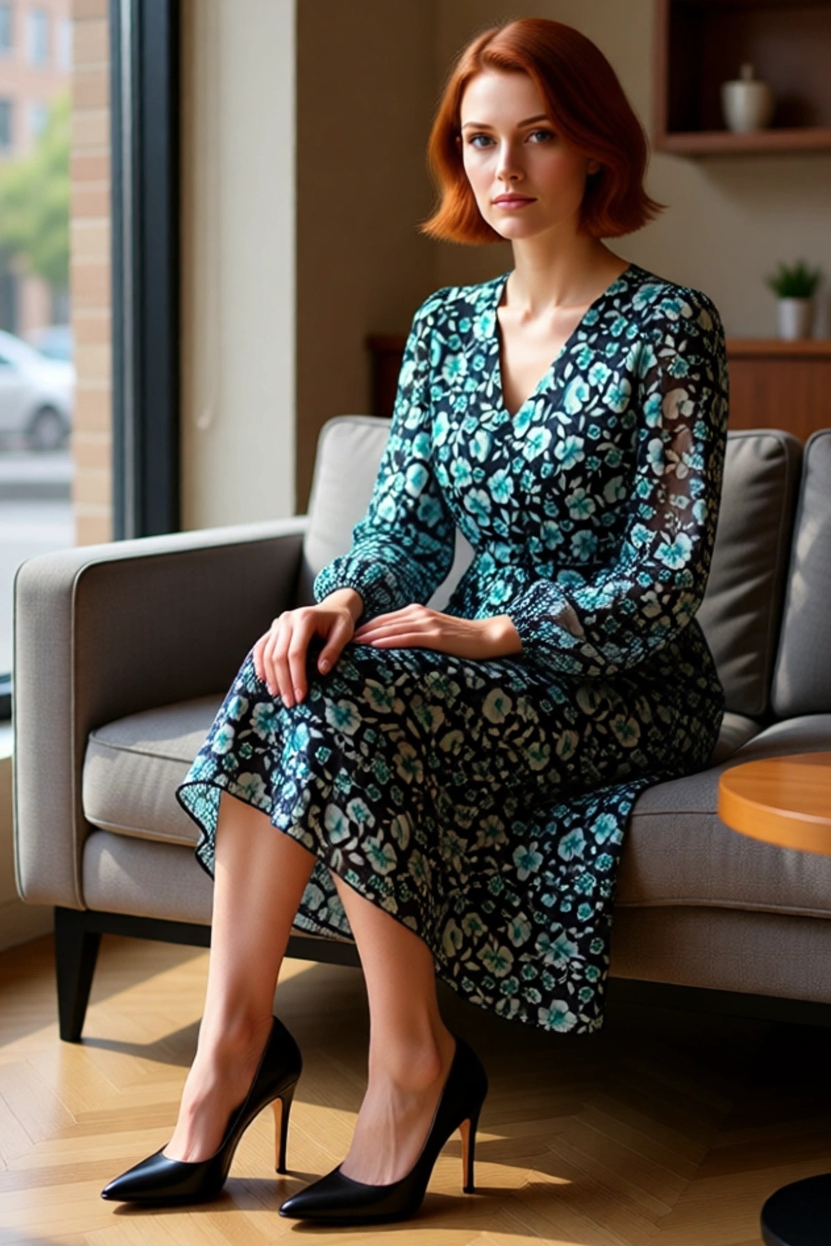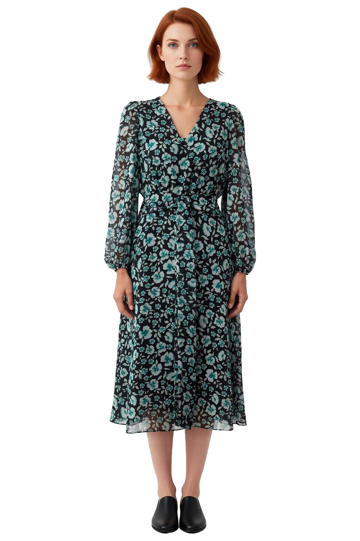 Kadın A Kesim Maxi Çiçekli Kuşaklı V Yaka Uzun Balon Kol Dokuma Şifon Elbise Zarafet Ve Konfor