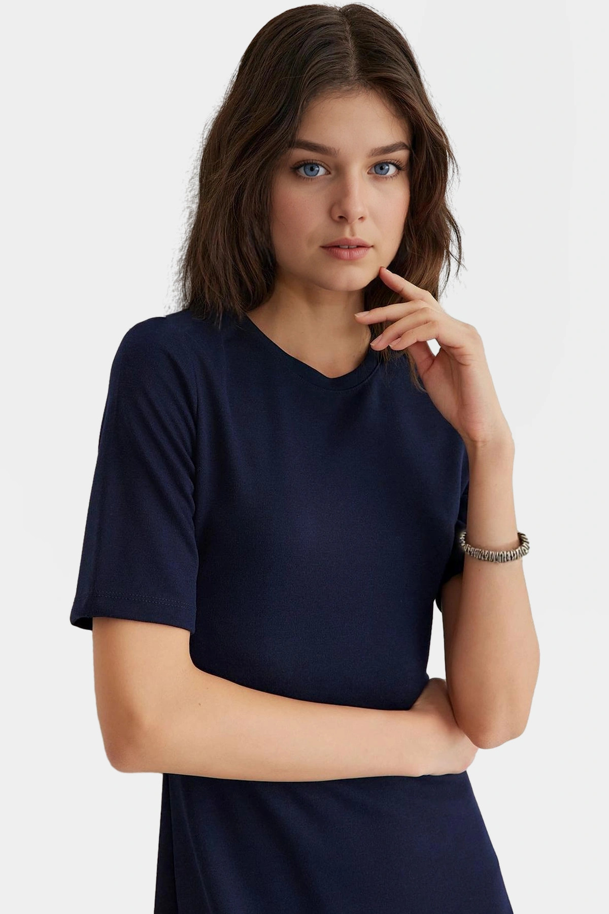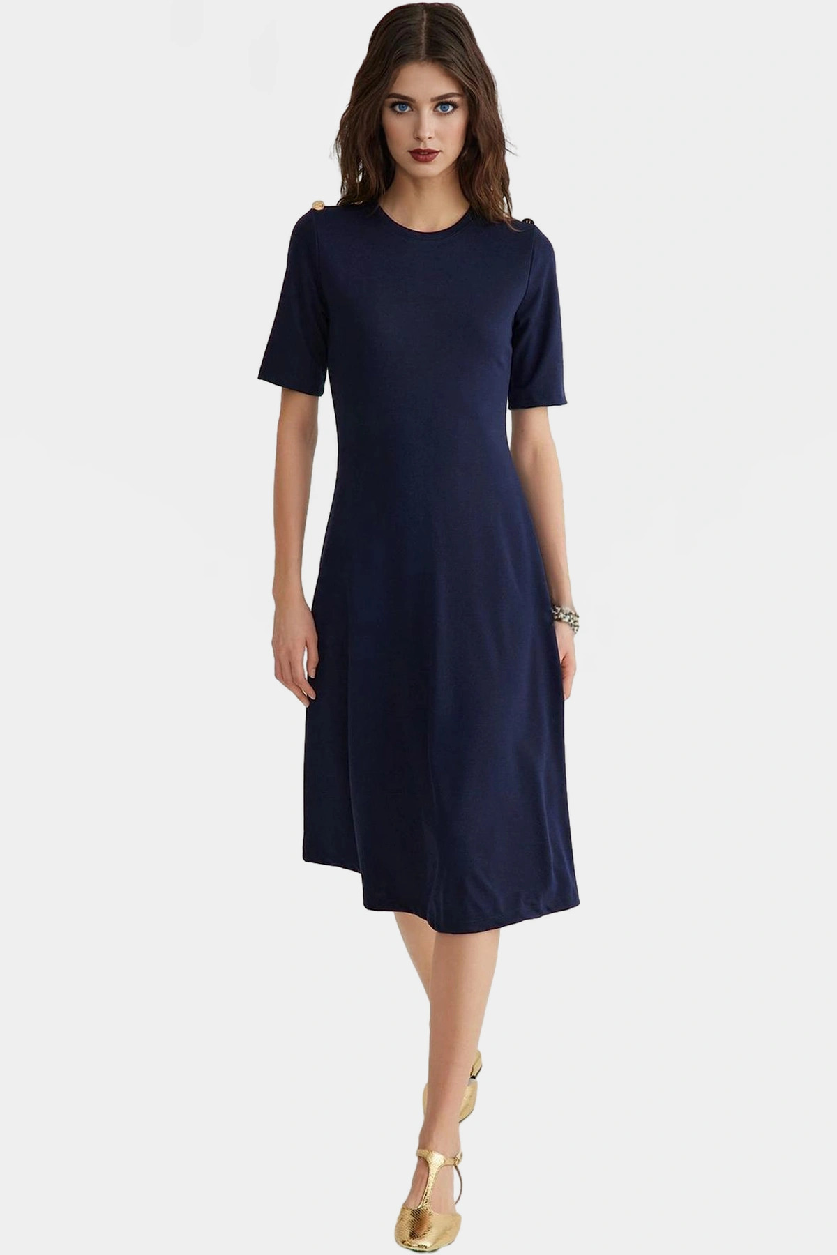 Bu lacivert A-line elbise, her kadının gardırobuna yakışacak bir parça. Günlük kullanıma uygun rahatlığı ve şık tasarımıyla, farklı ortamlarda kendinizi güvende ve güzel hissetmenizi sağlayacak. Yumuşak örme kumaşıyla gün boyu konfor sunar, %73 polyester, %25 pamuk ve %2 elastan karışımı, nefes alabilir ve kolay bakım gerektirir. Bisiklet yakası ve truva kolları ile hem modern hem de zamansız bir görünüm kazandırır.
