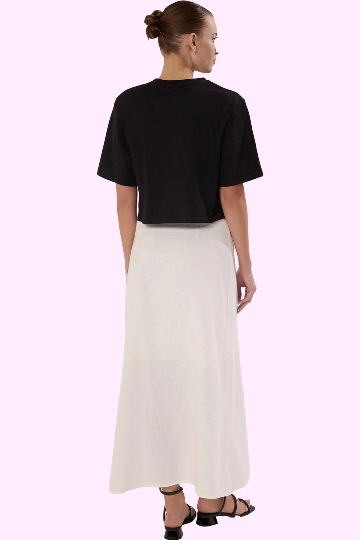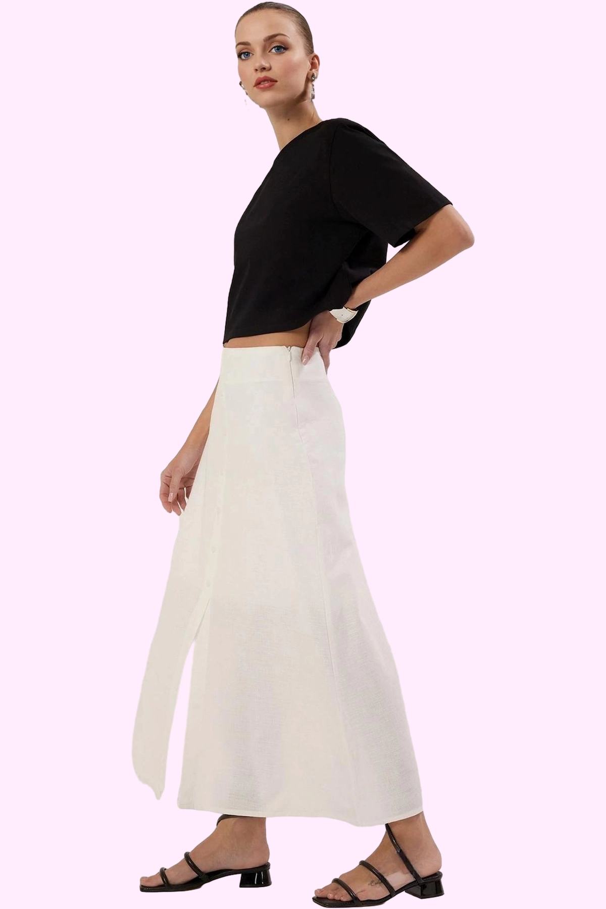 Rahatlığı ve şıklığı bir arada arayan modern kadınlar için tasarlanmış bu A-line maxi etek, yaz aylarının gözdesi olacak. %100 pamuktan üretilen dokuma kumaşı, gün boyu nefes alabilirlik ve konfor sunarken, keten görünümlü tasarımı ile şıklığı ön plana çıkarıyor. Düğme detaylı ön kısmı ve yırtmaçlı tasarımıyla hem modern hem de feminen bir tarz oluşturmanıza yardımcı olur. Casual veya günlük kombinleriniz için mükemmel bir seçenek olan etek, çeşitli üstlerle kolayca kombinlenebilir.