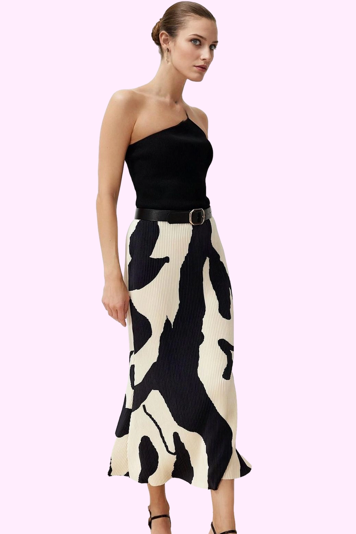 Bu sezonun trendlerinden biri olan A-line kesimli, ekru renkli ve soyut desenli midi etek, gardrobunuzun vazgeçilmezi olacak! %100 polyester kumaştan üretilen etek, yumuşak dokusu ve nefes alabilir yapısı ile gün boyu konfor sunar. Yüksek bel tasarımı ve piliseli dokusuyla, zarif ve şık bir görünüm elde edersiniz. Kemer detayı ile belinizi ince gösteren etek, farklı kombinlerle kullanabileceğiniz çok yönlü bir parçadır.