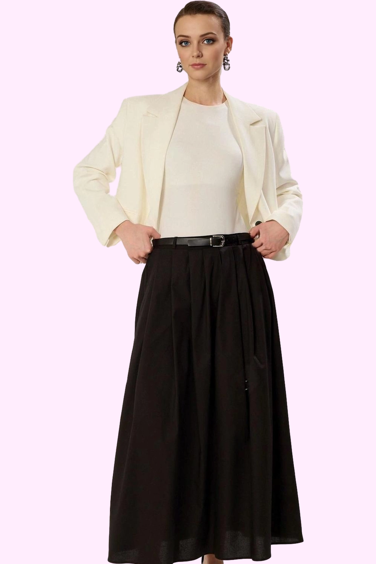 Günlük şıklığınıza modern bir dokunuş katacak olan siyah eteğimiz, rahatlığı ve şıklığı bir araya getiriyor. A-line kesimiyle her vücut tipine mükemmel uyum sağlayan eteğimiz, pileli detaylarıyla hareketli ve dinamik bir görünüm sunuyor. Yüksek kaliteli terrycotton dokuma kumaşı, hem yumuşak hem de nefes alabilir bir yapıya sahip. Maxi boy uzunluğu ve rahat kesim, gün boyu konforlu bir kullanım sağlıyor. Belindeki şık kemer detayı ile belinizi ince gösterirken, aynı zamanda şık ve feminen bir görünüm yaratıyor.