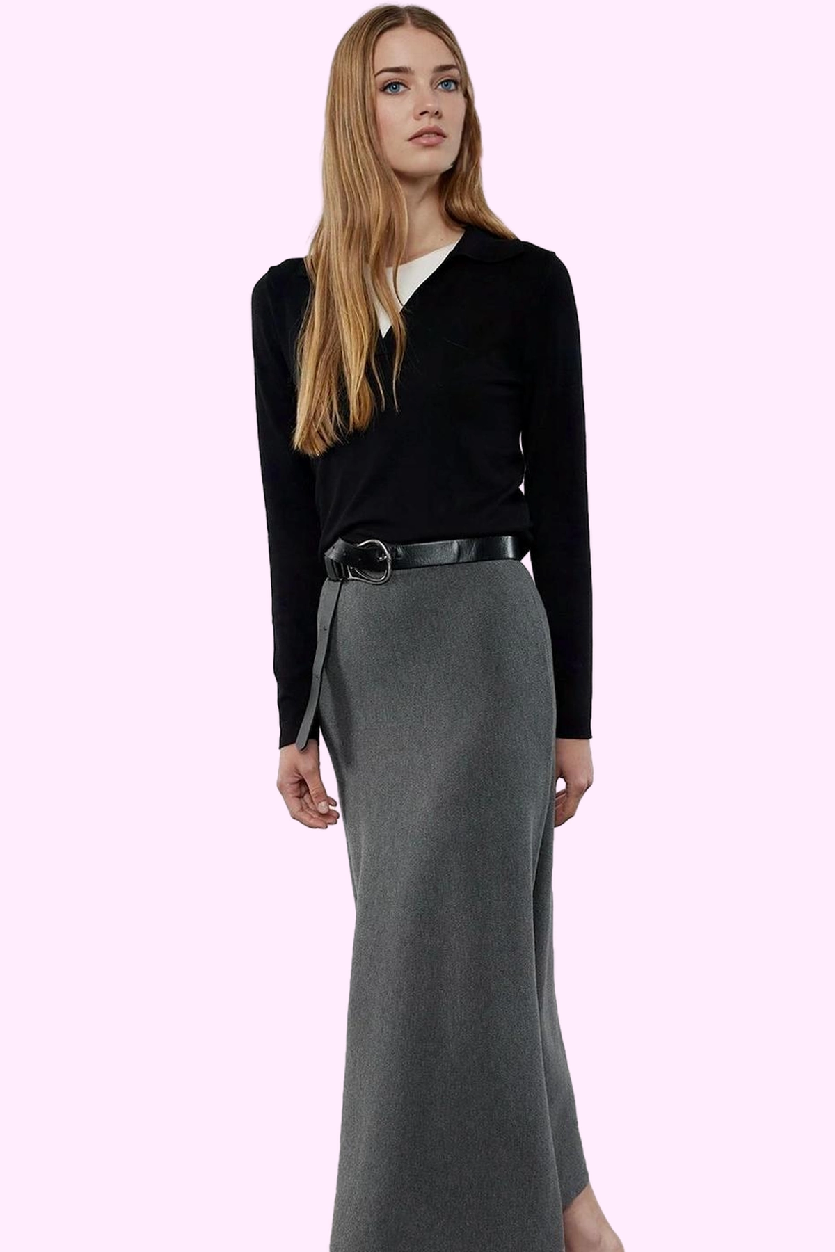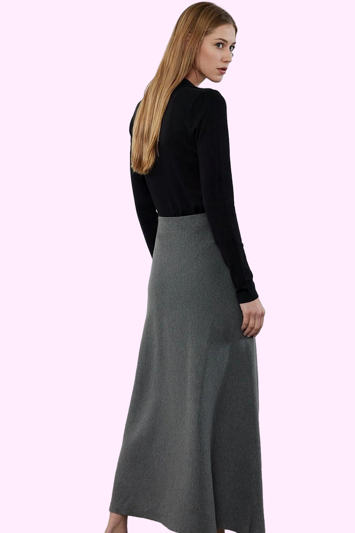 Bu sezonun trendlerinden olan gri renkli A-line triko maxi etek, dokusuyla ve şıklığıyla dikkat çekiyor. Yumuşak ve rahat triko kumaştan üretilen etek, gün boyu konforlu bir kullanım sunuyor. A-line kesimiyle vücut hatlarınızı güzel bir şekilde sararken, maxi boyu ile her kombini tamamlayacak şıklıkta. Kemer detayı ise eteğinize ince bir bel görünümü kazandırıyor. İlkbahar ve sonbahar aylarına uygun ince yapısıyla sıcak havalarda bile rahat etmenizi sağlıyor.