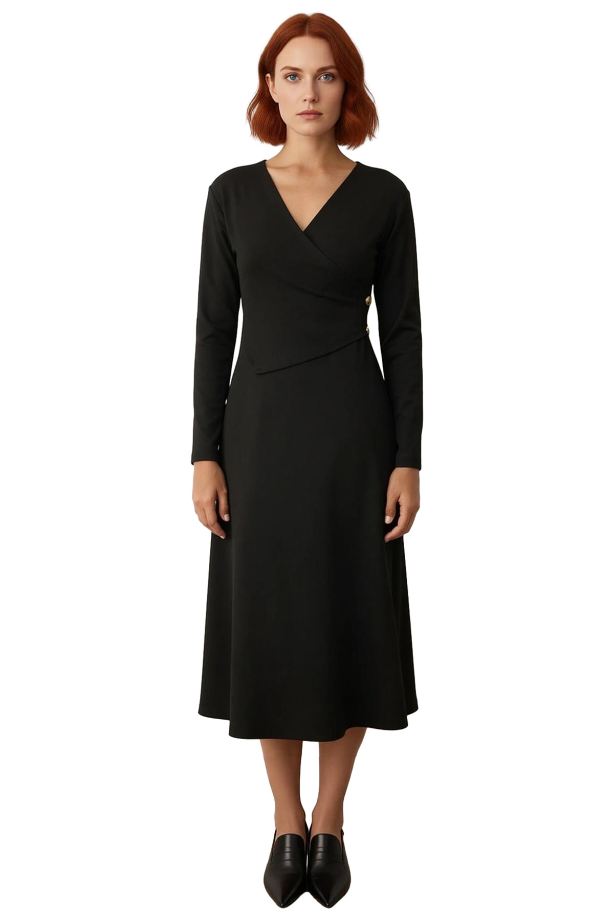 Kadın A Line Uzun Kollu V Yaka Düğmeli Maxi Elbise Düz Örme Kış Sezonu Smart Şıklık Kaliteli