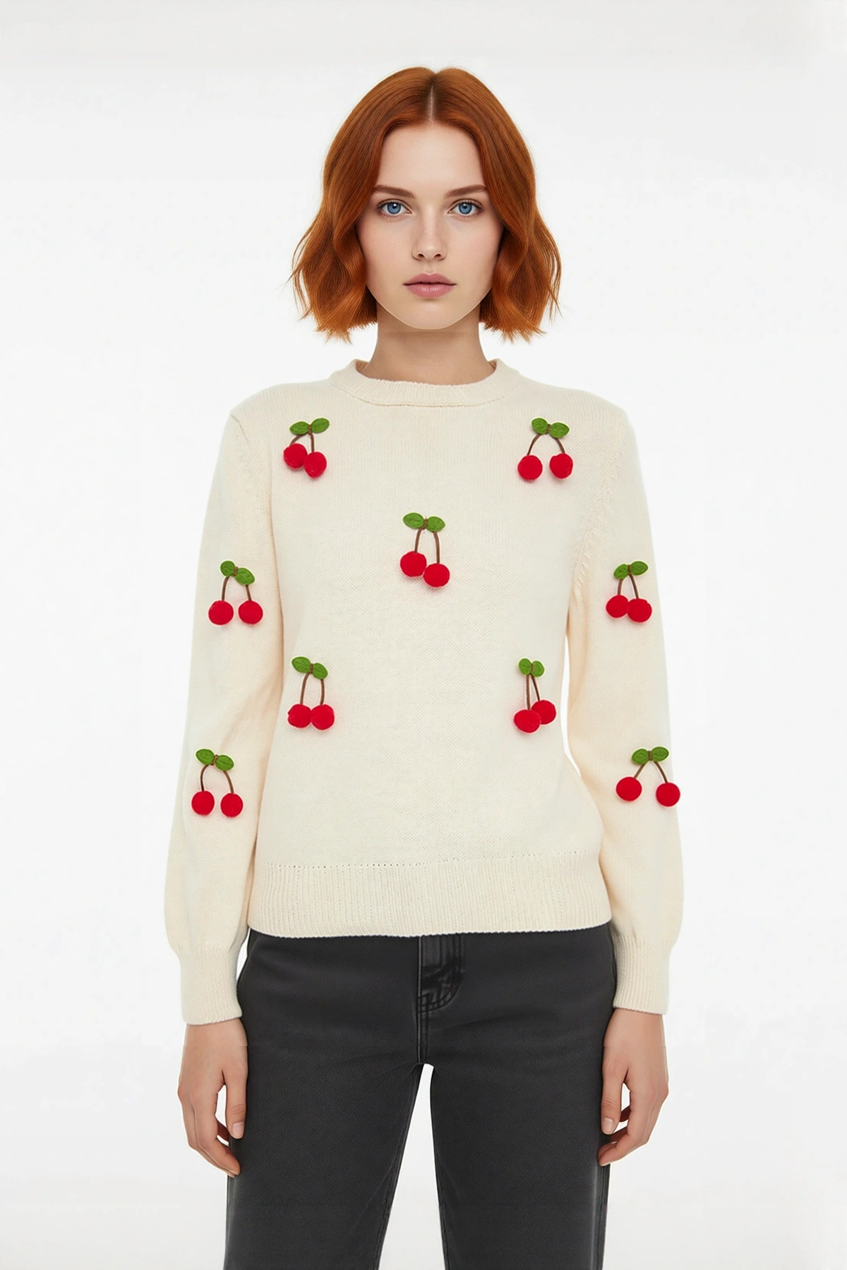 Ürün Özellikleri: Regular kalıp, %100 akrilik materyal, nakışlı işlemeli desen, bisiklet yaka, standart uzun kol, triko kumaş, ekru renk.