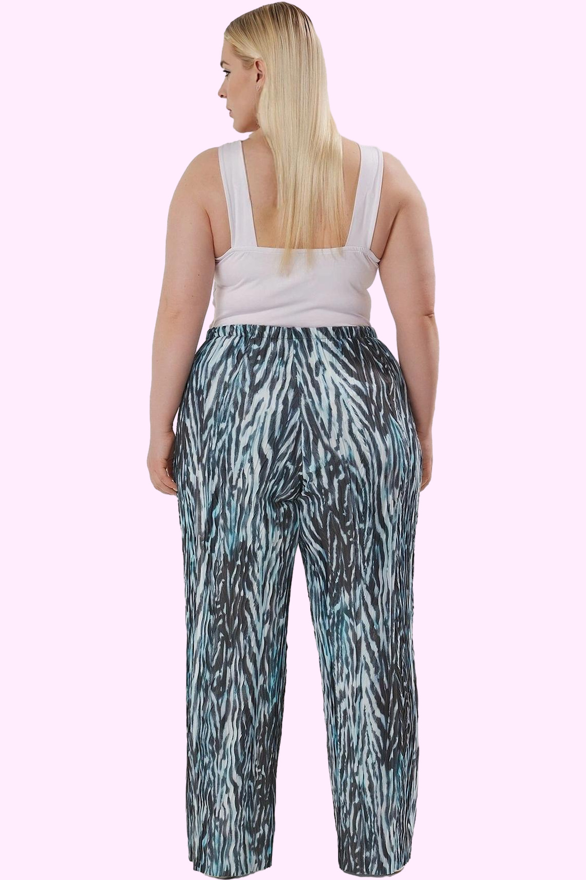 Kendinizi rahat ve şık hissetmenizi sağlayacak, göz alıcı bir pantolonla karşınızdayız! Büyük beden kadınlara özel olarak tasarlanan bu lacivert pantolon, animal desenli örme kumaşıyla dikkatleri üzerinize çekecek. Yüksek bel tasarımı, vücut hatlarınızı kusursuz bir şekilde ortaya koyarken, geniş paçası sayesinde gün boyu özgürce hareket edebilirsiniz. 100% polyester malzemeden üretilen pantolon, nefes alabilir yapısıyla sıcak yaz günlerinde bile konforlu bir kullanım sunuyor. Günlük kombinleriniz için ideal olan bu pantolon, tişörtler, bluzlar ve gömleklerle mükemmel bir uyum yakalıyor. Hem spor hem de şık kombinler için uygundur. Hafif ve kolay yıkanabilir özelliğiyle pratik kullanım sağlar. Bu pantolonun ölçülerine göz atarak size en uygun bedeni seçebilirsiniz. Bu rahat ve şık pantolonla kendinizi özel hissedeceksiniz.