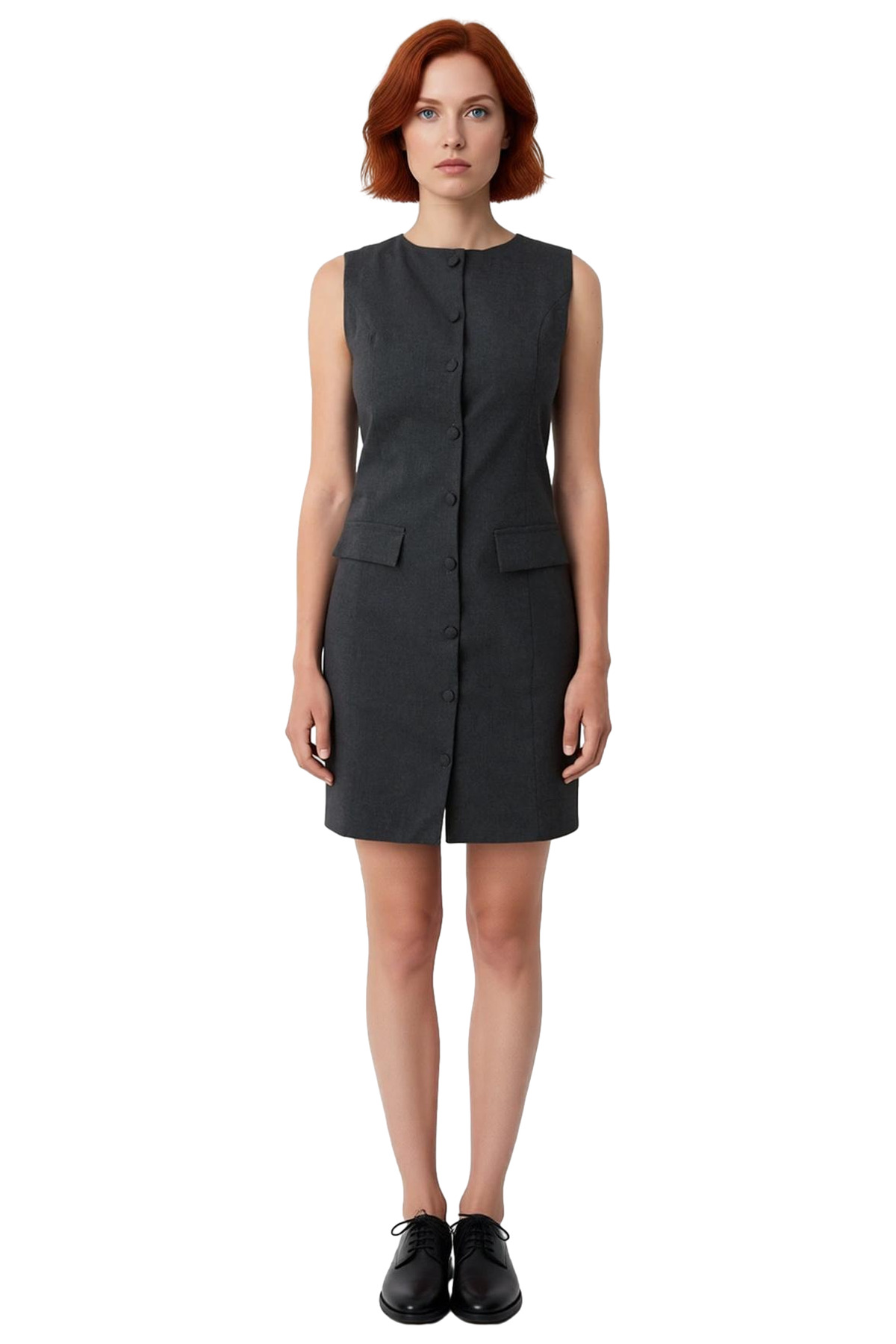 Ürün Özellikleri: Gömlek elbise kalıp, %100 polyester materyal, düz desen, bisiklet yaka, kolsuz, dokuma kumaş, antrasit renk, düğmeli kapama.